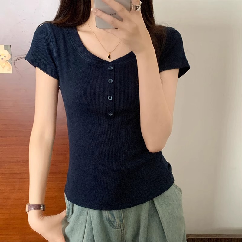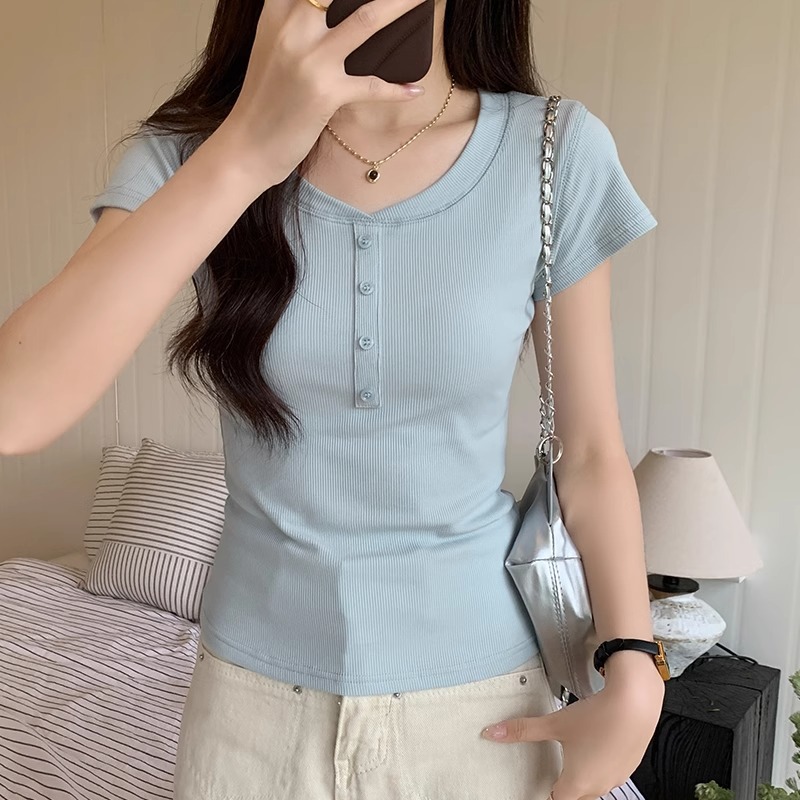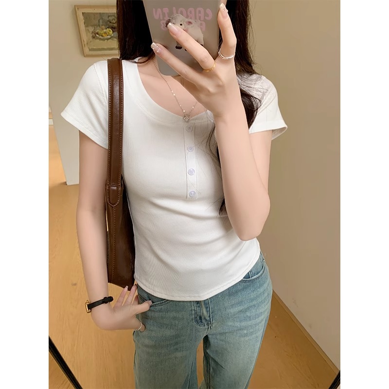 白色正肩t恤女短袖春夏新款辣妹修身显瘦设计感纽扣半开领短上衣