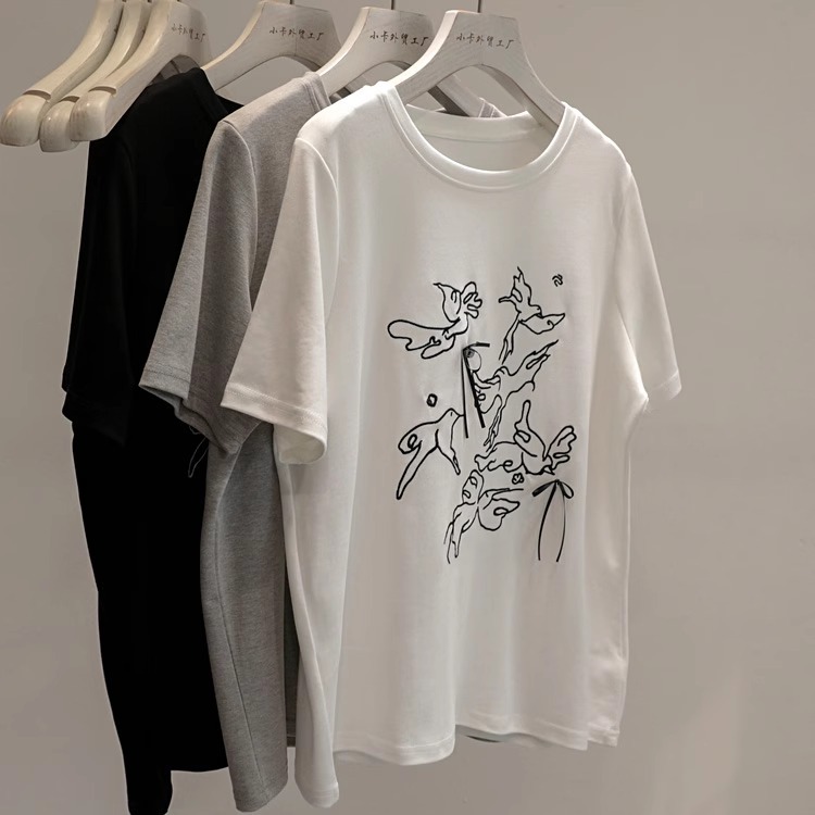 最近超爱~国风刺绣飞鸟蝴蝶结短袖T恤女正肩圆领打底衫上衣潮