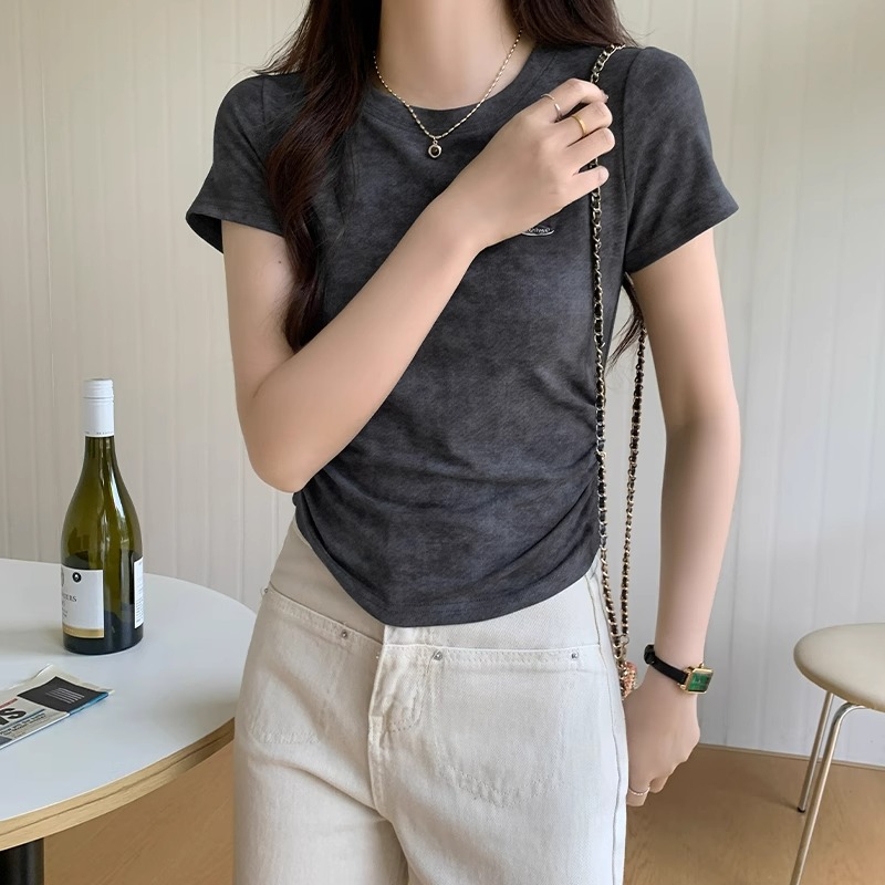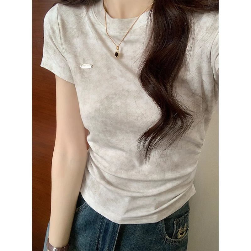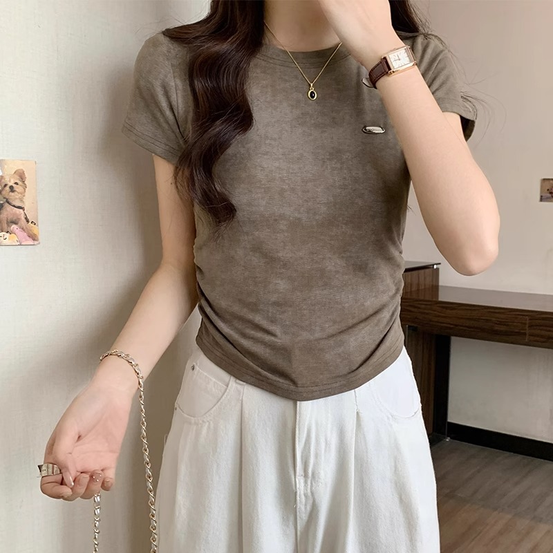 美式圆领正肩短袖t恤女春夏新款设计感抽褶收腰纯欲修身小衫上衣