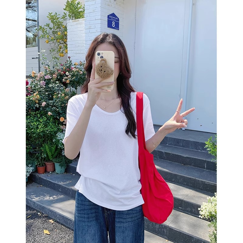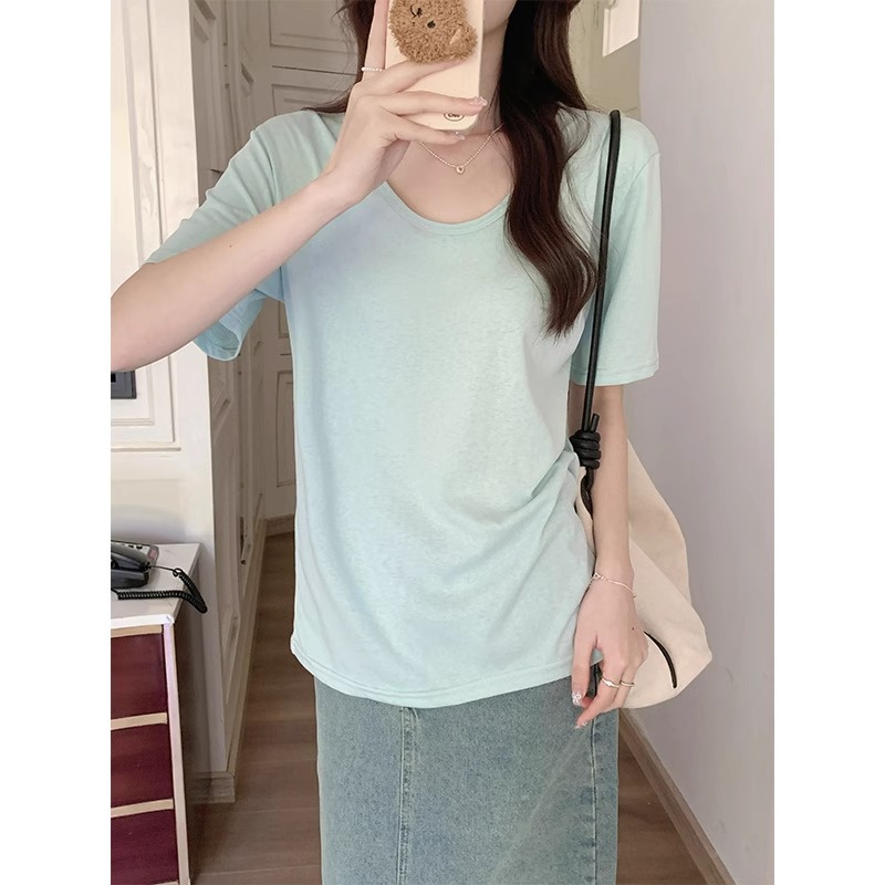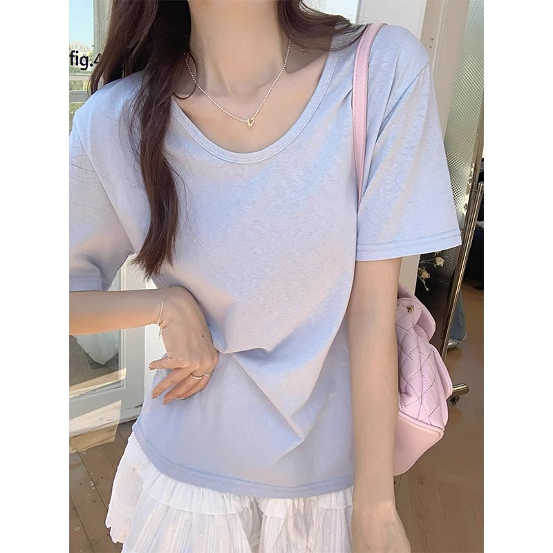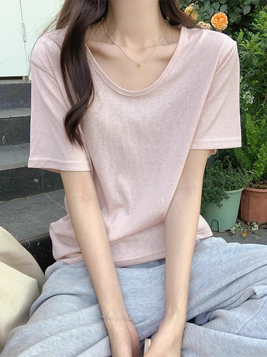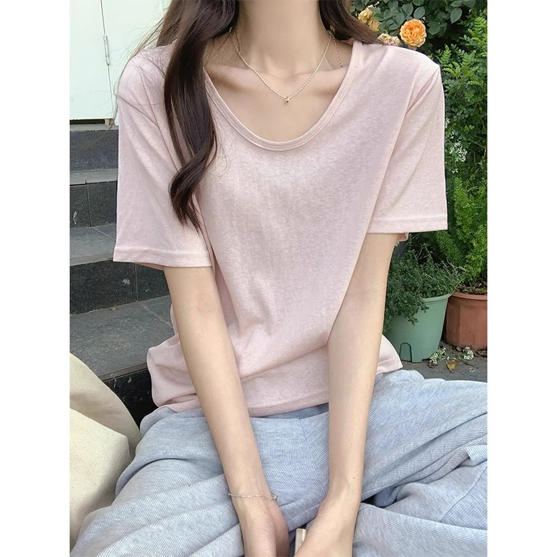 小清新粉色多巴胺短袖t恤女夏季U领宽松大领口雪花棉半袖上衣