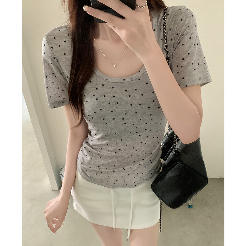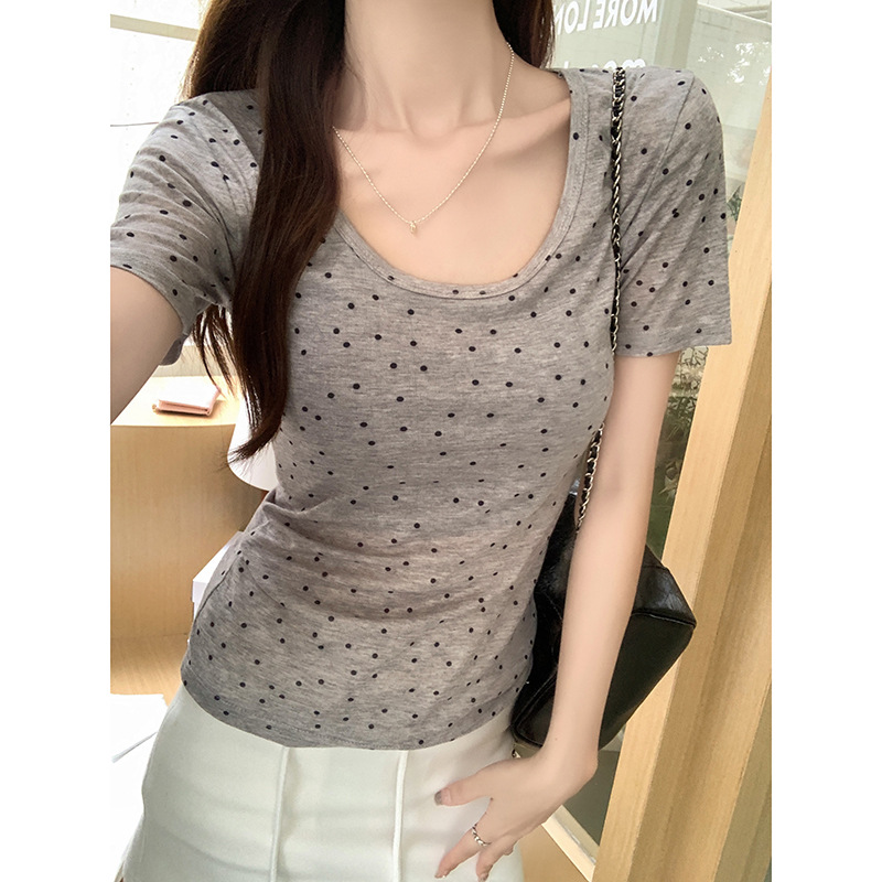 纯欲薄款U领波点短袖t恤女夏季新款正肩百搭修身显瘦气质绝美上衣