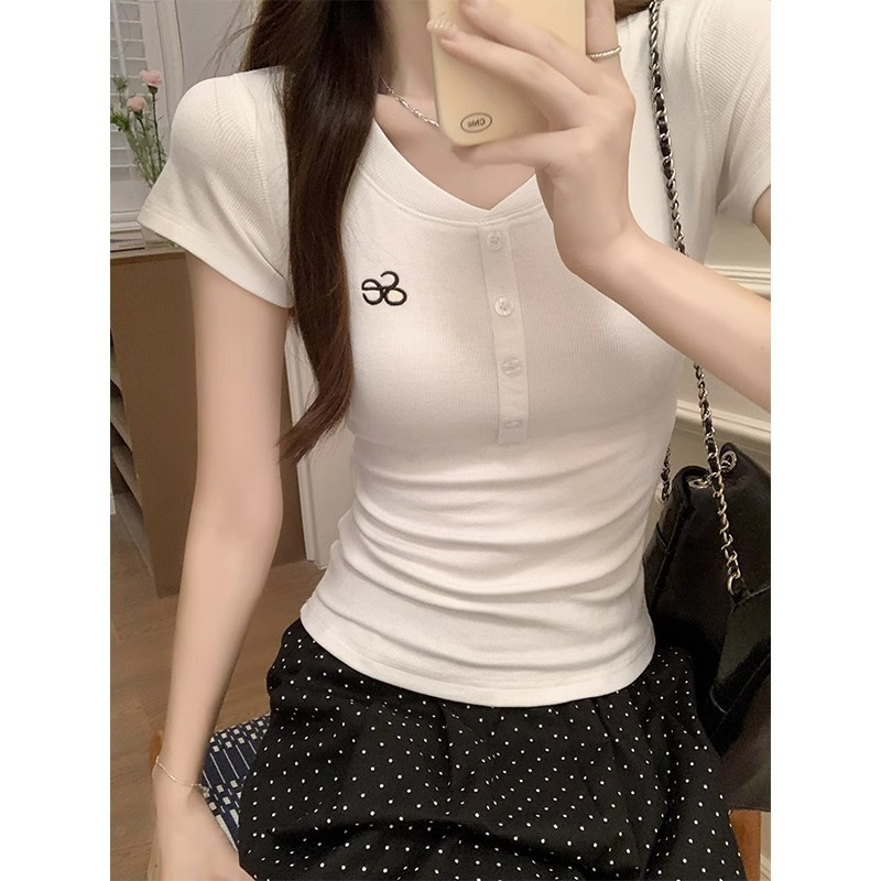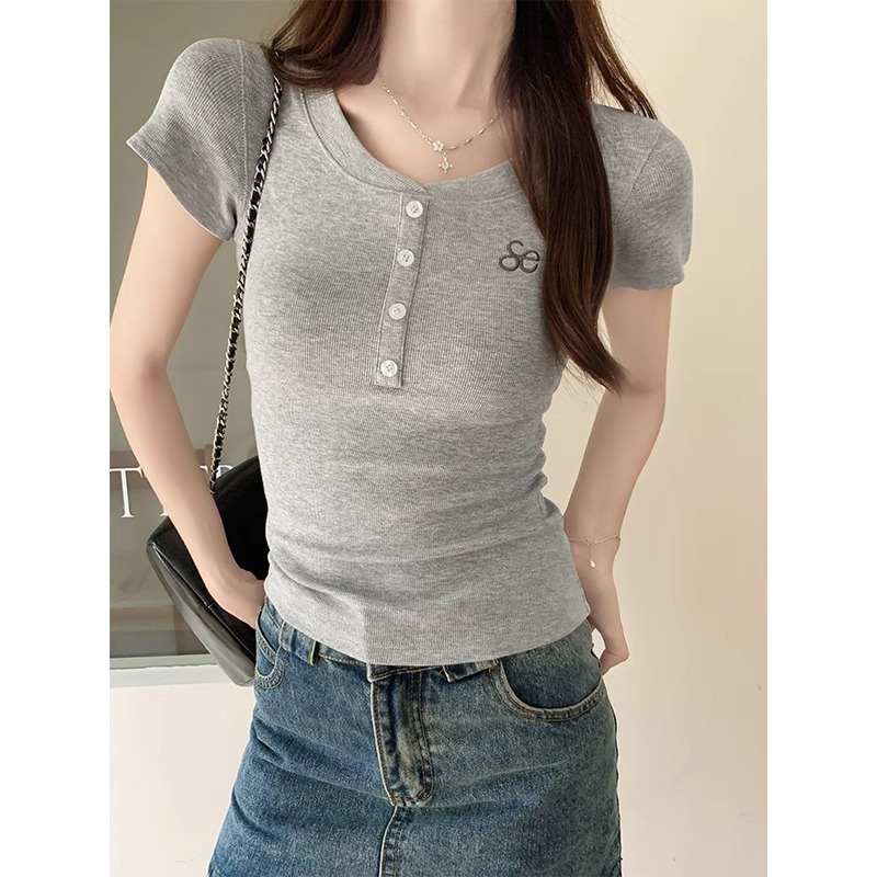 高级灰刺绣螺纹正肩短袖t恤女纯欲半开领收腰显瘦短款半袖上衣夏