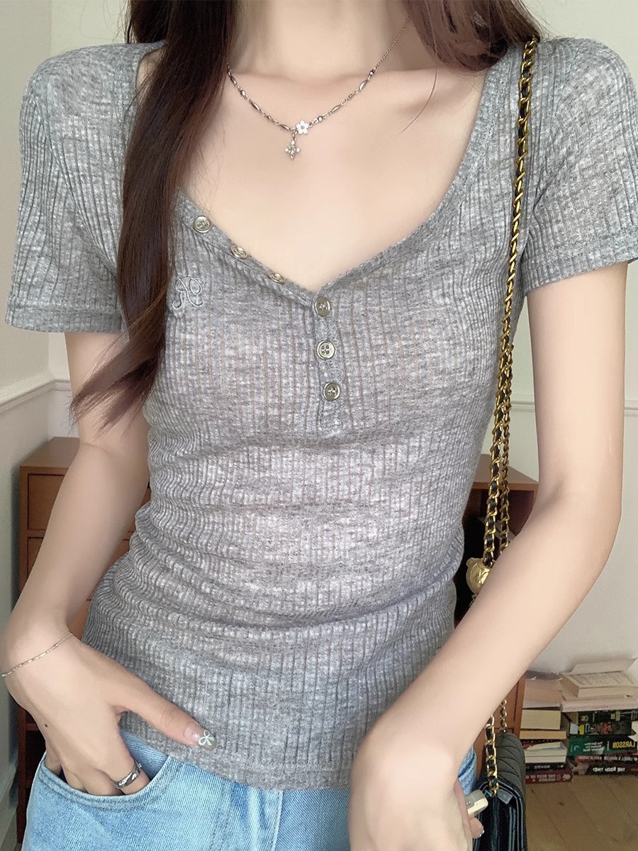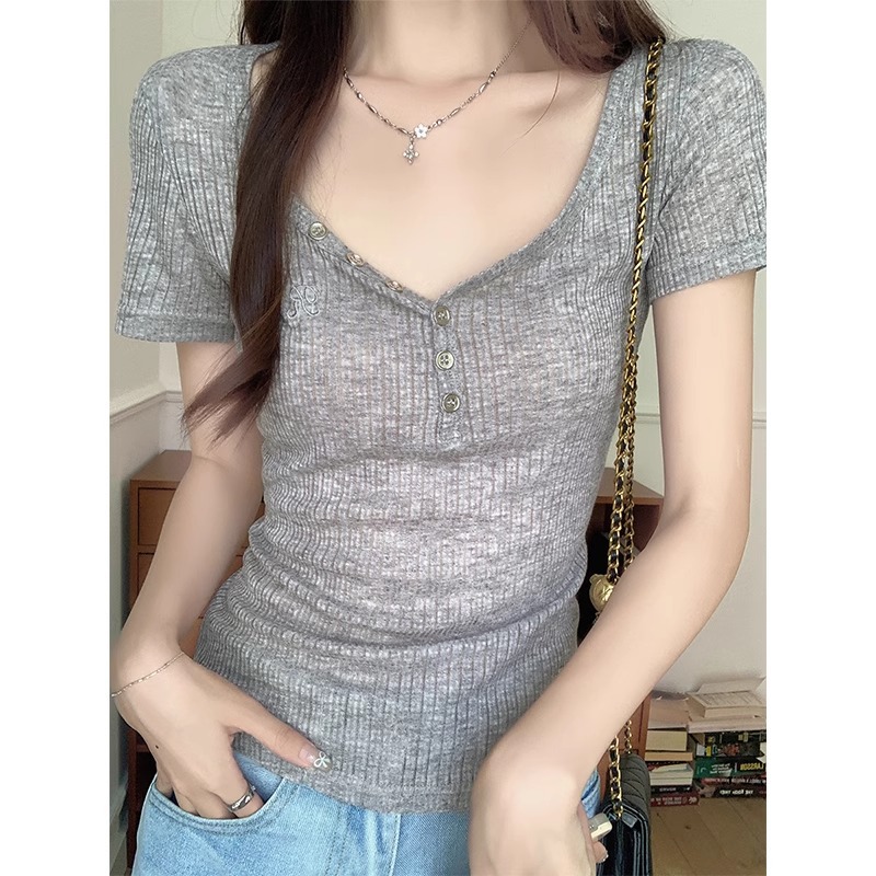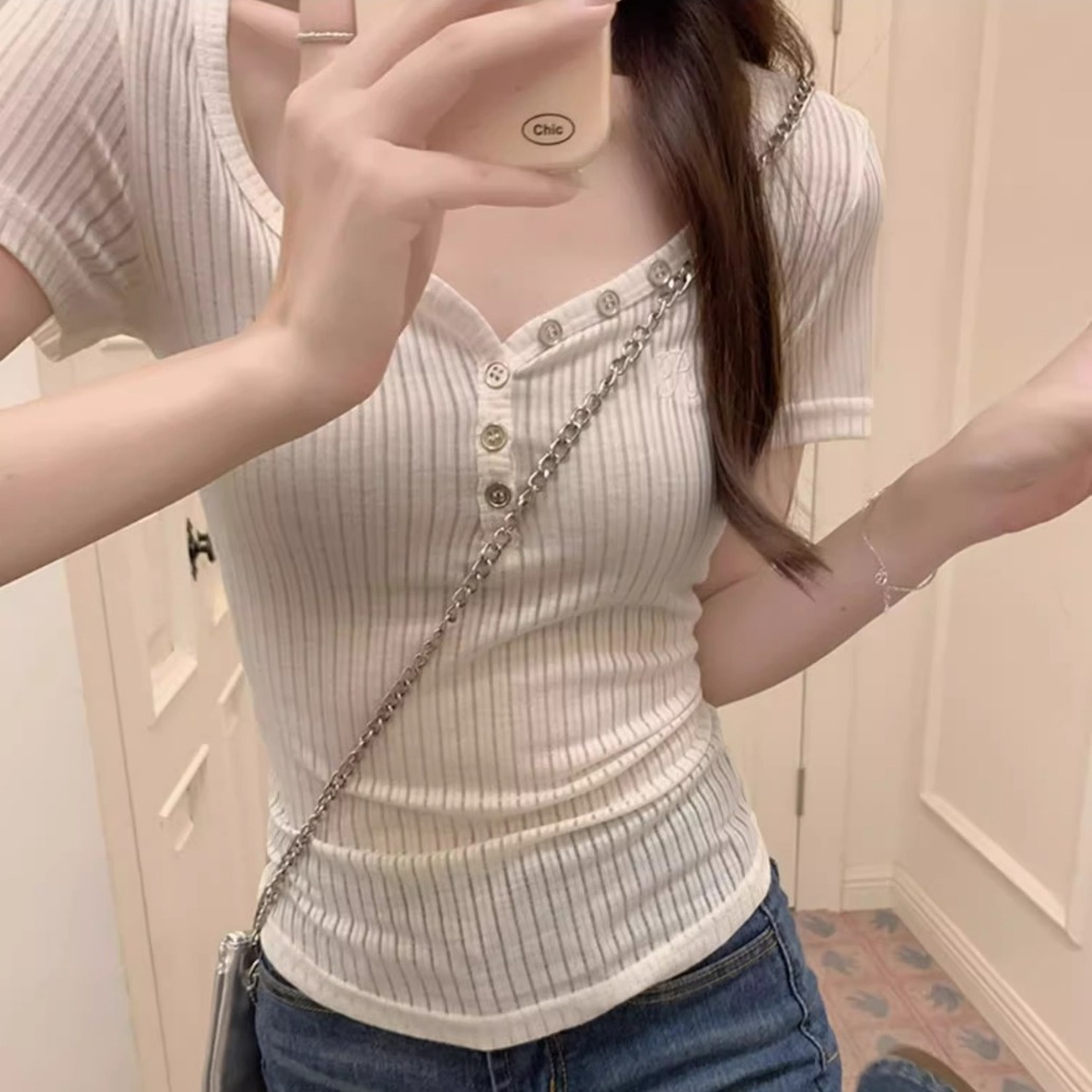 方领露锁骨修身打底衫夏季新款短袖露脐T恤学生短款上衣女ins
