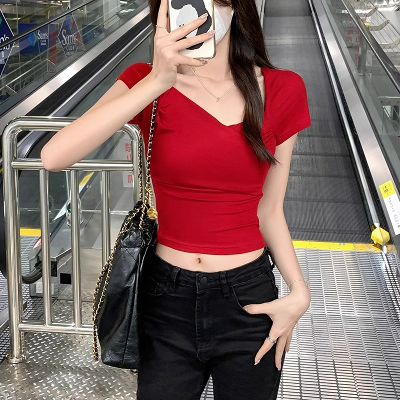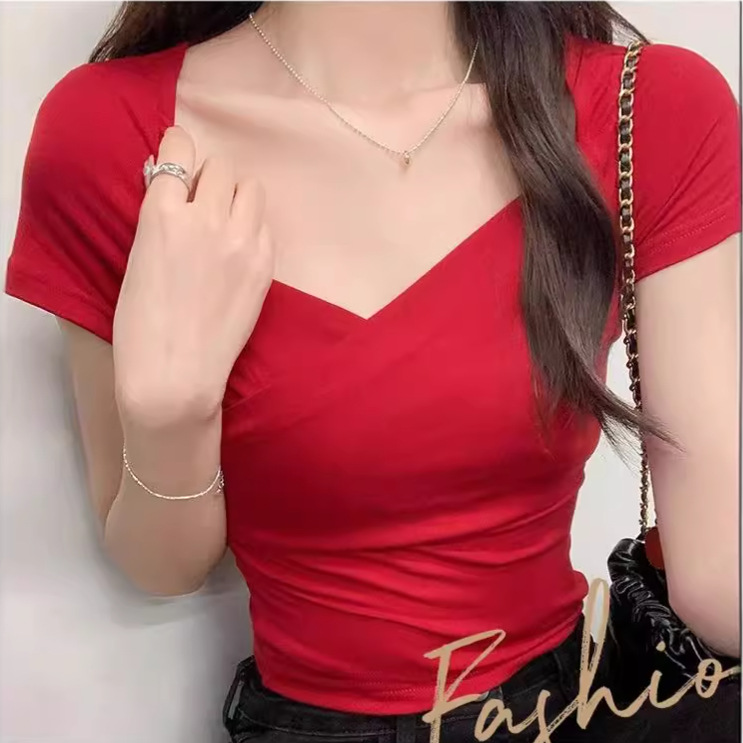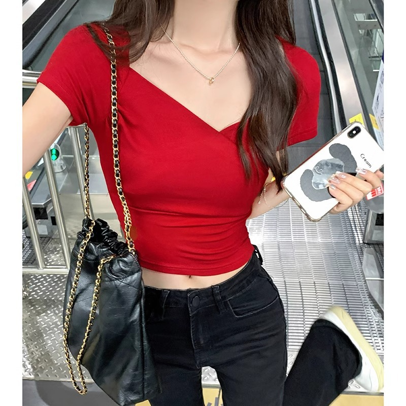 夏季热辣美式红色性感露锁骨正肩短款大V领交叉T恤修身显瘦上衣女