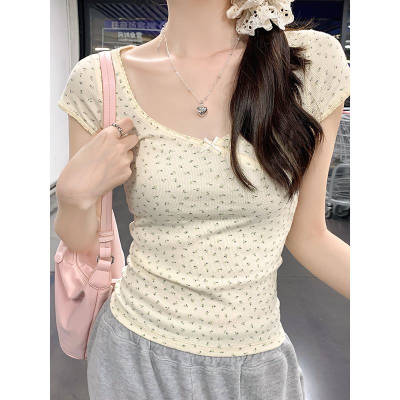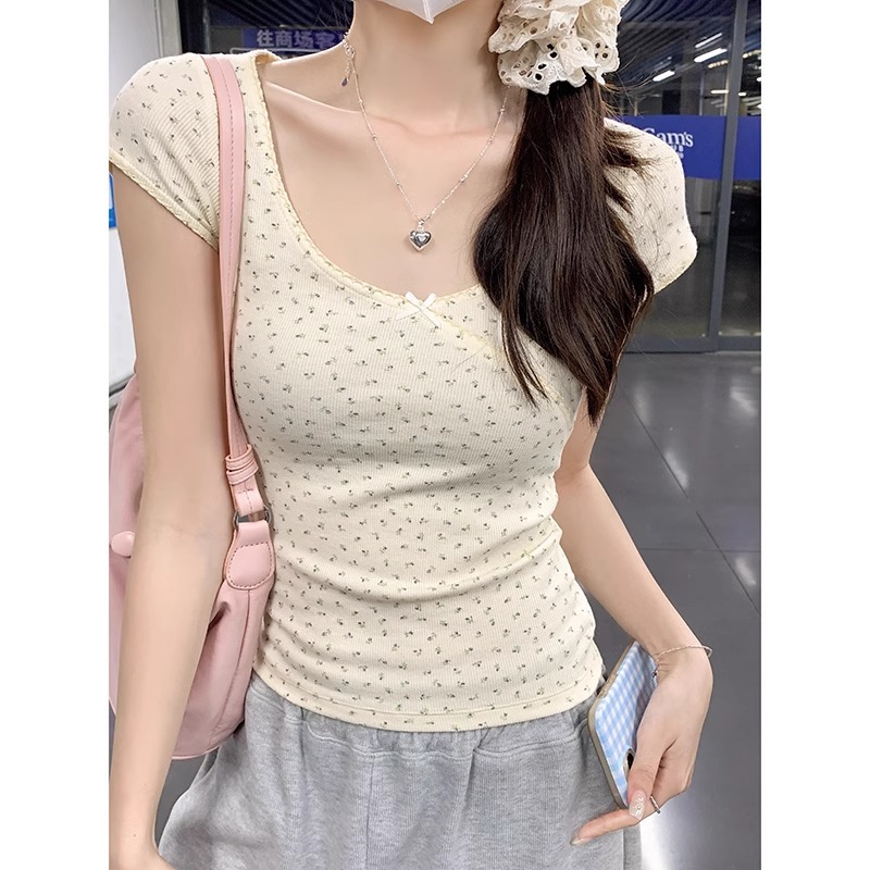 法式小清新正肩U领碎花短袖t恤女夏季bm风甜辣妹设计感修身上衣潮