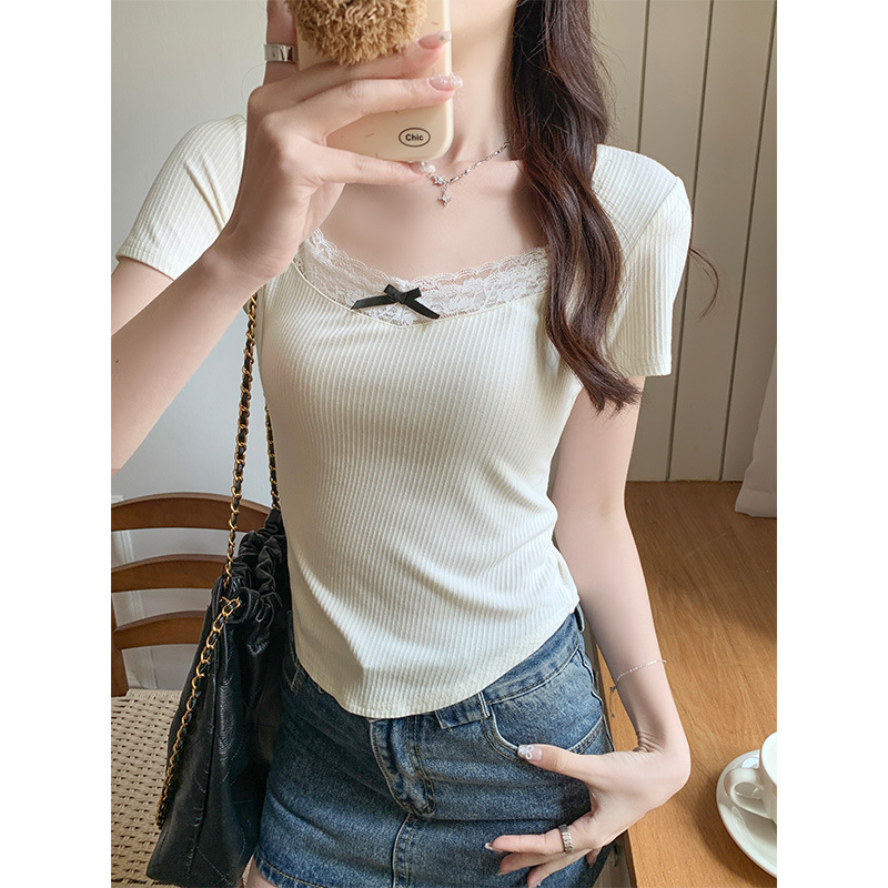 灰色拼接蕾丝花边v领短袖t恤女夏季内搭打底衫修身别致纯欲风上衣