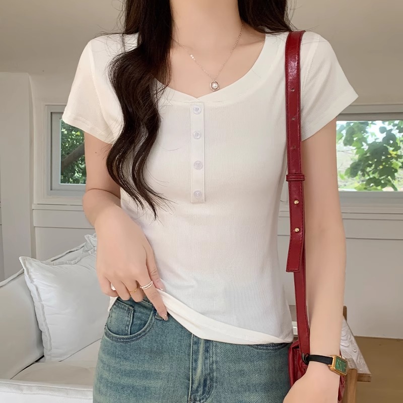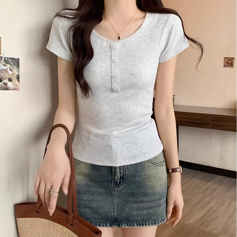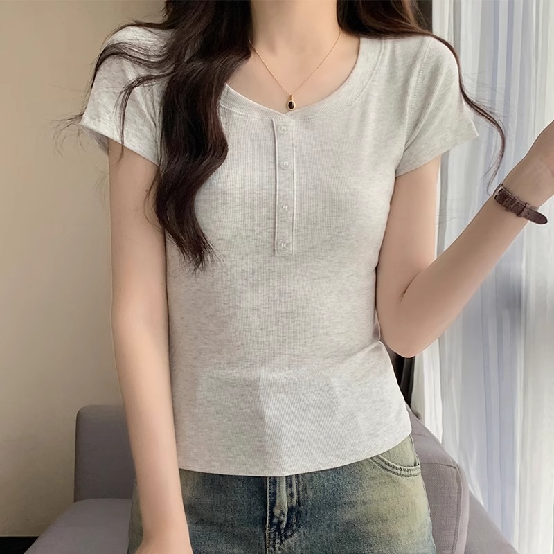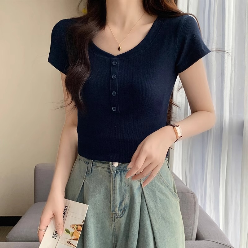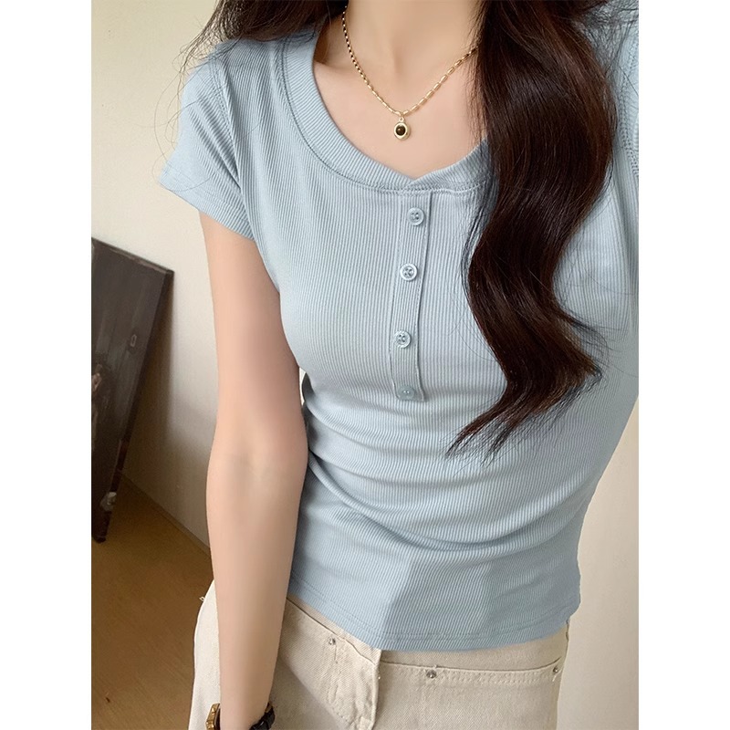 蓝色温柔正肩短袖t恤女春夏新款半开领洋气修身显瘦打底螺纹上衣