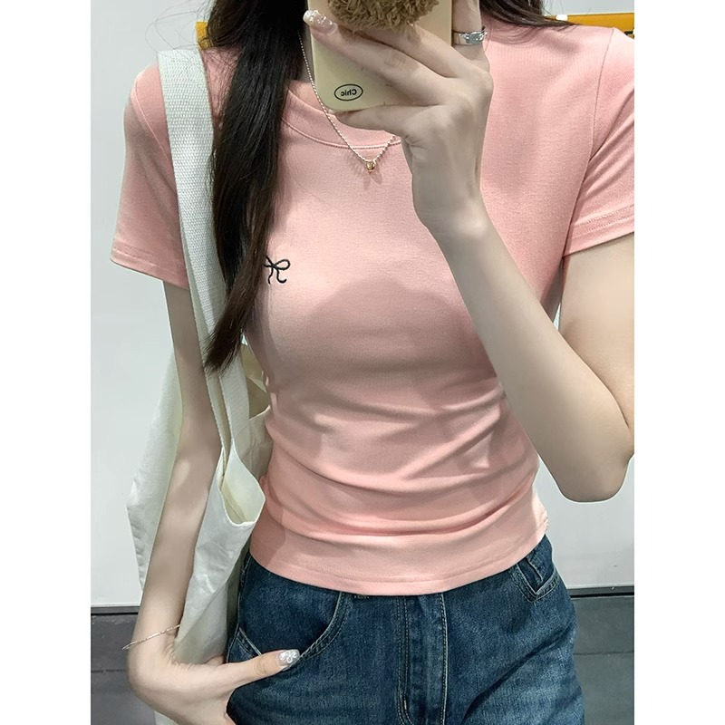 正肩短袖t恤女夏新款蝴蝶结圆领时尚刺绣修身打底衫辣妹洋气上衣