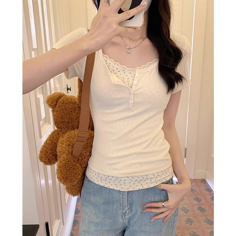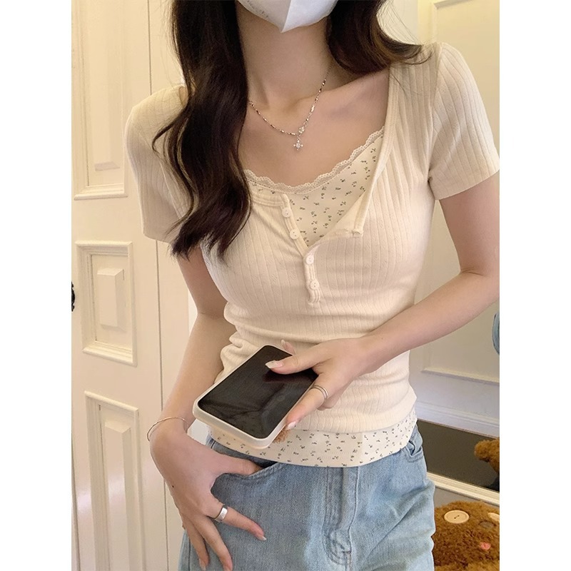 碎花蕾丝边短袖t恤女春夏新款设计感半开领纯欲辣妹bm假两件上衣