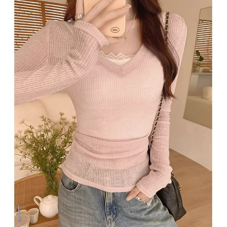 纯色冰丝薄款防晒罩衫长袖上衣女甜辣妹v领性感修身显瘦针织T恤夏
