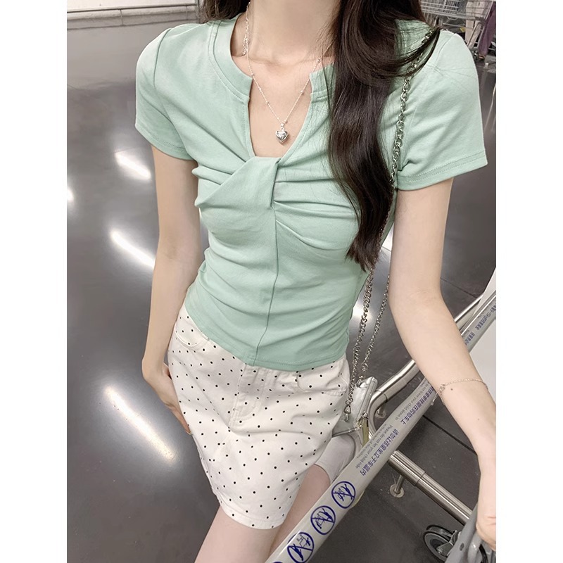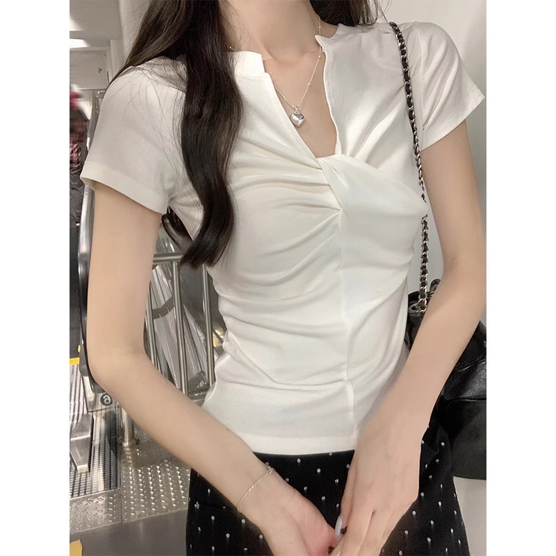 法式褶皱扭结设计感短袖T恤女夏新款收腰显瘦一字肩通勤上衣