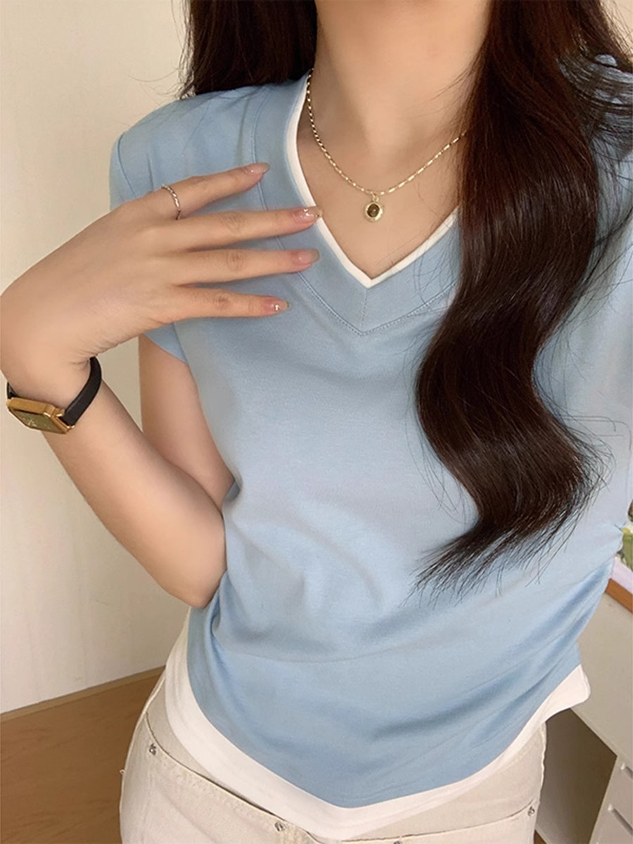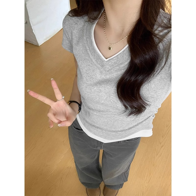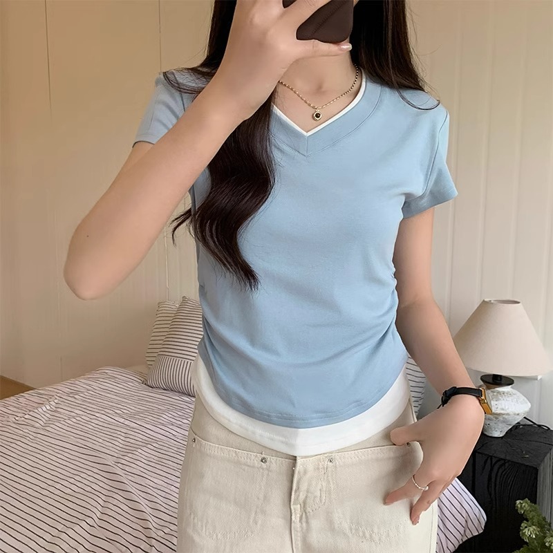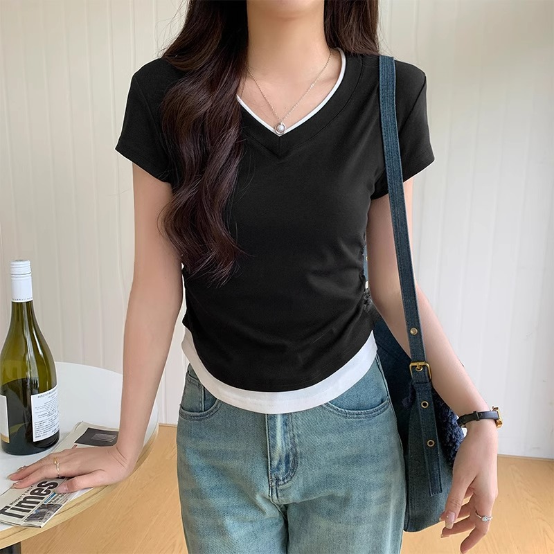 弧形下摆V领正肩t恤女短袖春夏新款设计感抽褶收腰显瘦假两件上衣