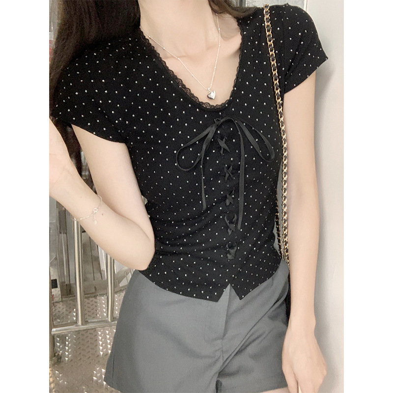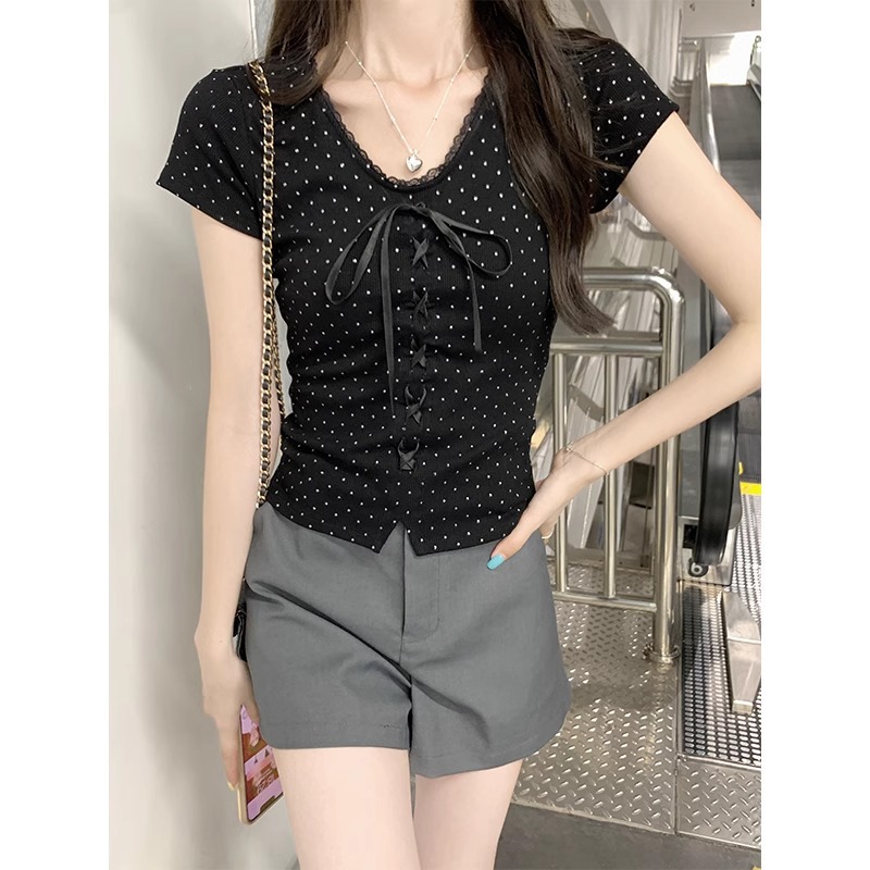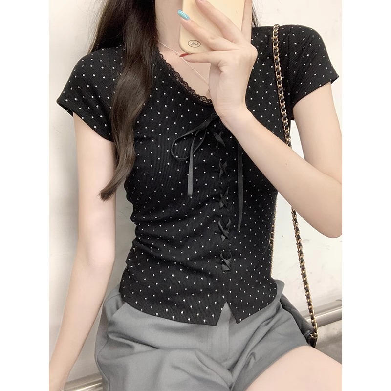 纯欲蕾丝花边系带短袖T恤女夏季黑色波点烫钻辣妹修身短款v领上衣