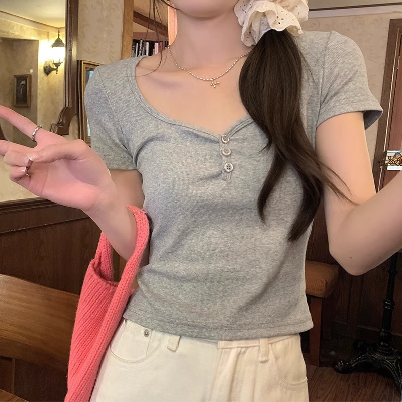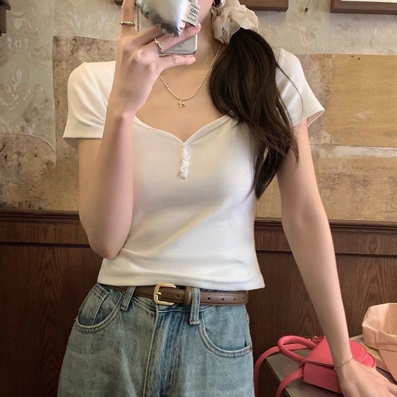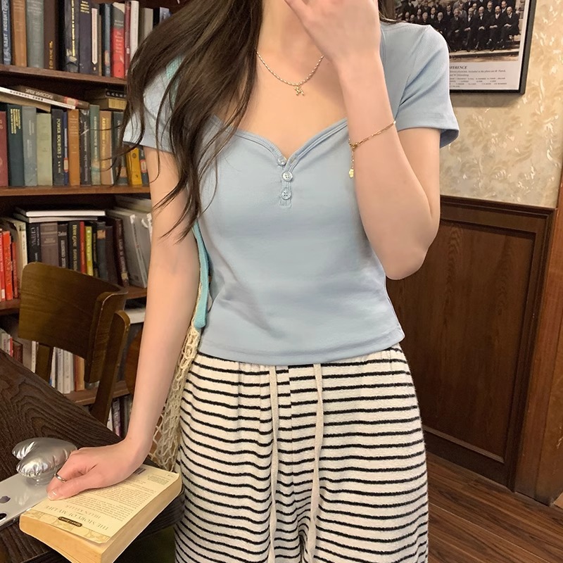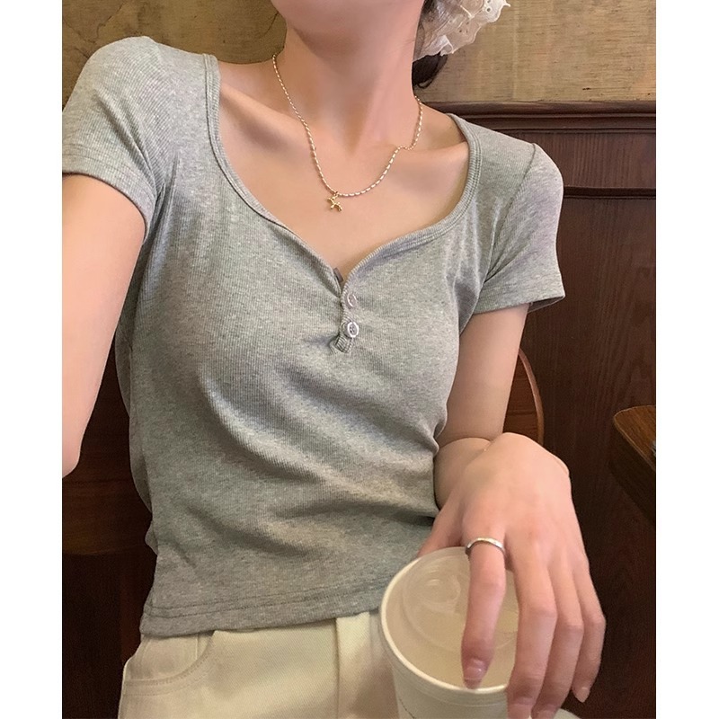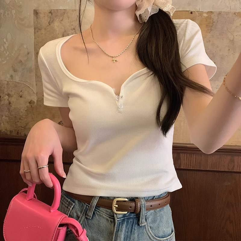 bm短款大领口显瘦锁骨短袖t恤女春夏新款多巴胺正肩甜辣上衣