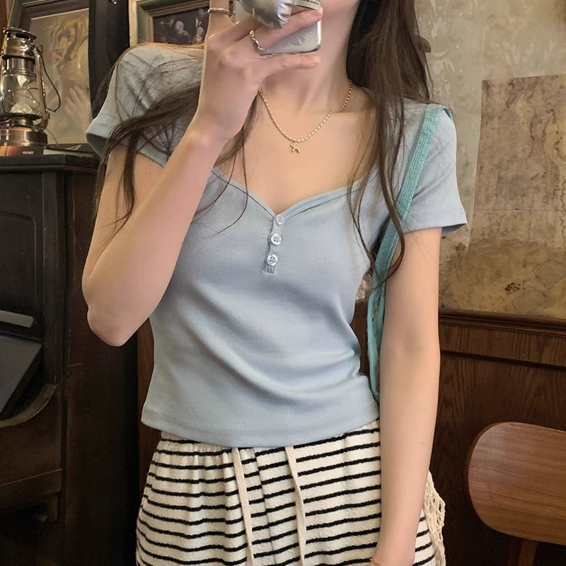纯欲甜辣妹假两件蓝色短袖t恤女正肩春夏韩系穿搭半开领拼色上衣
