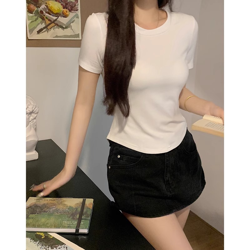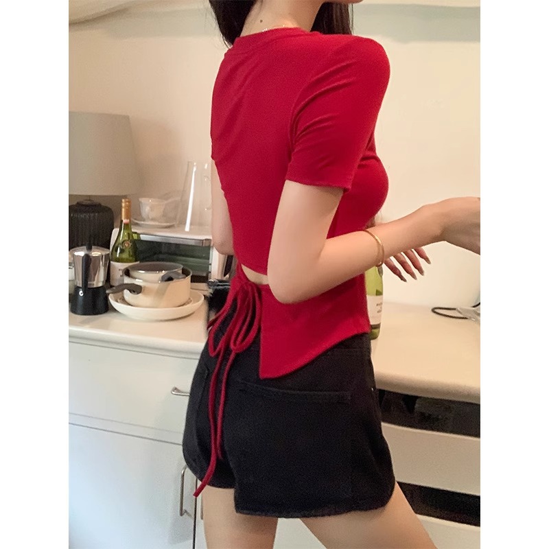 甜辣妹系带露腰不规则设计感短袖正肩修身短款纯欲T恤女夏季上衣