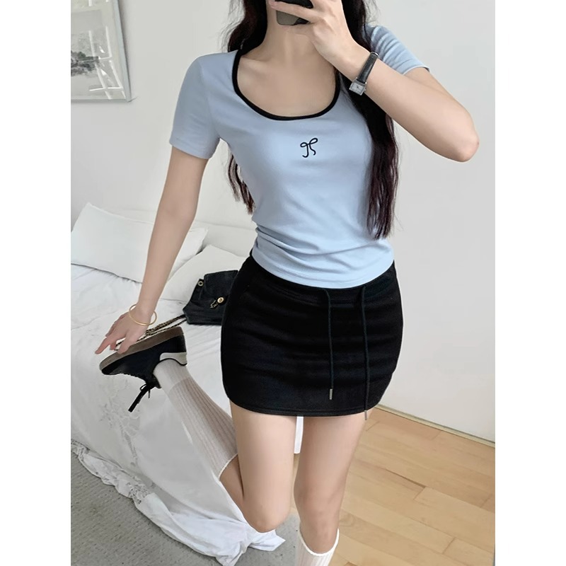 美式复古撞色短款U领弹力修身上衣蝴蝶结刺绣夏季短袖T恤女