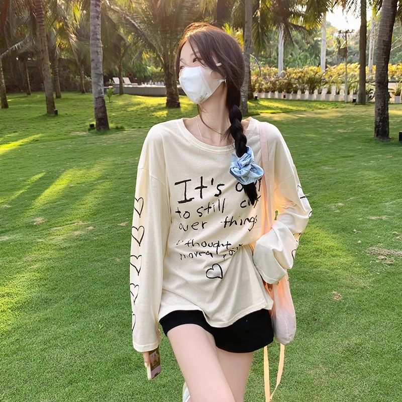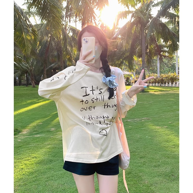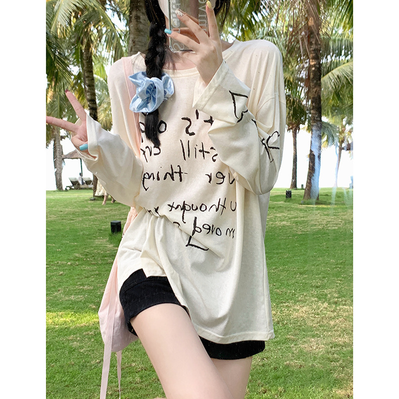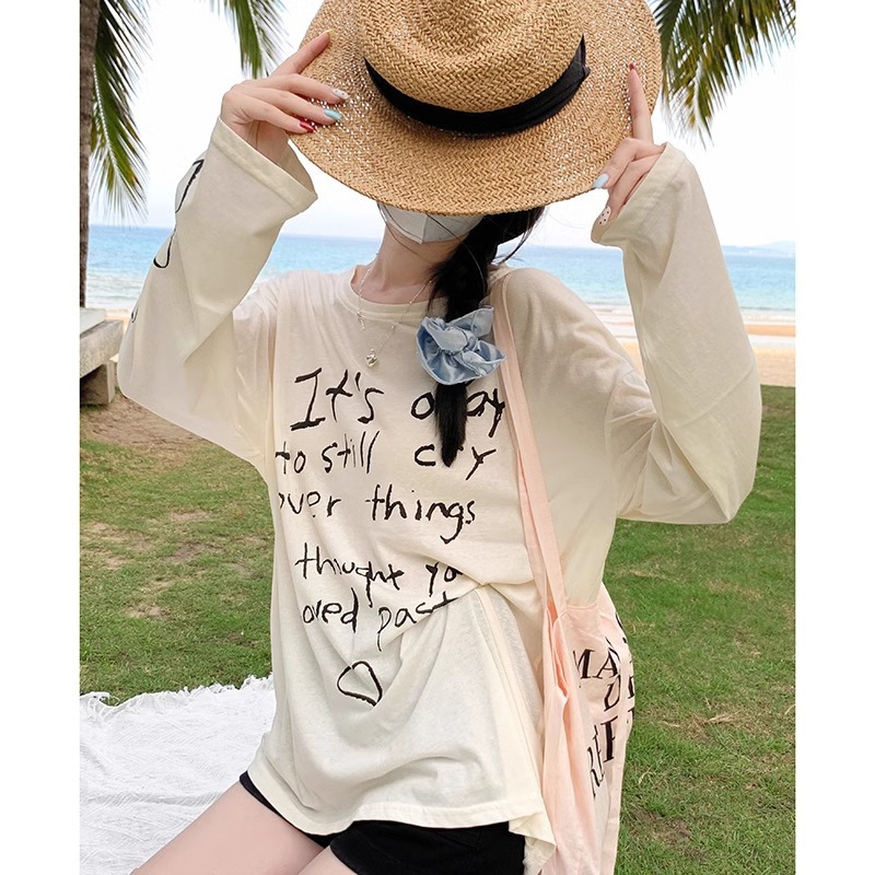 慵懒风圆领字母印花薄款防晒罩衫夏季长袖T恤女宽松休闲百搭上衣