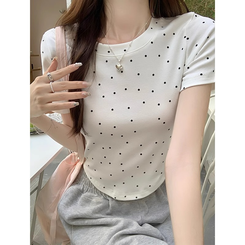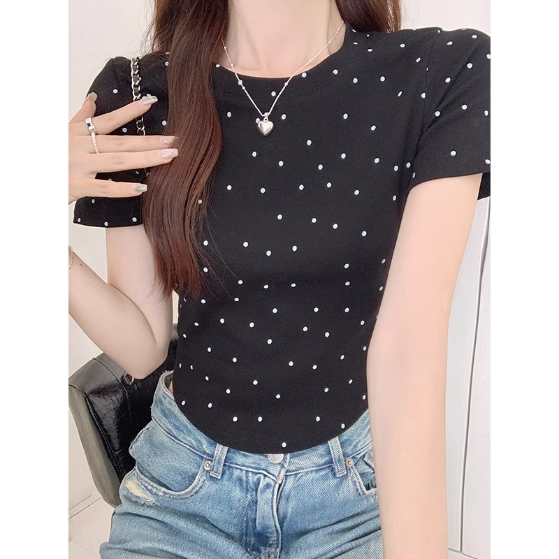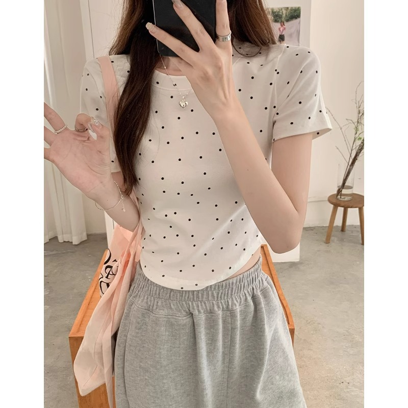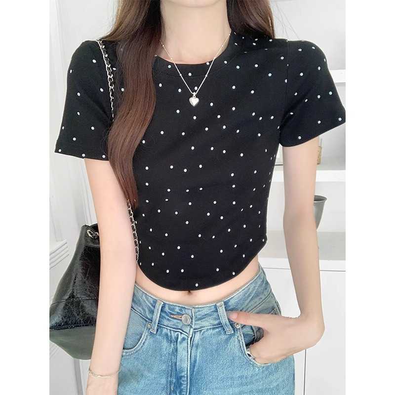 灰色波点圆领短袖T恤女纯欲露脐收腰短款正肩辣妹小个子夏季上衣