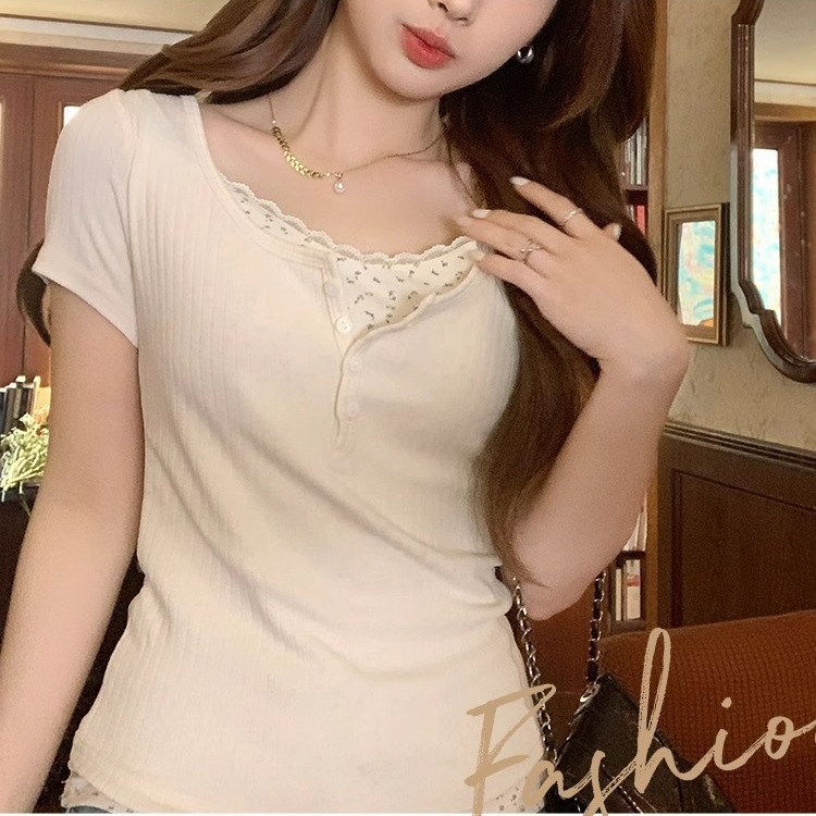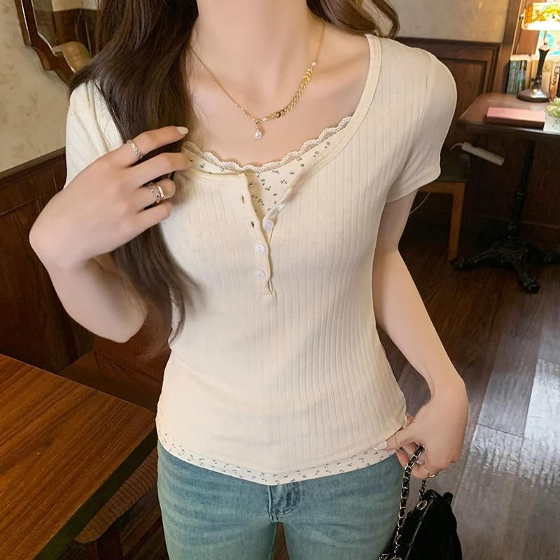 紧身显瘦正肩U领拼接碎花短袖T恤女春夏纯欲bm风半开领假两件上衣