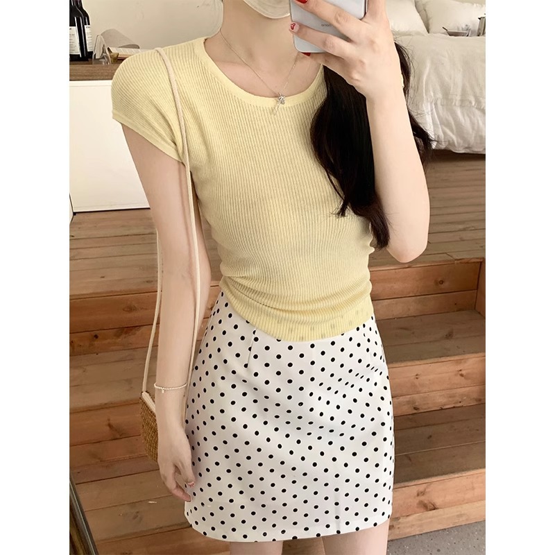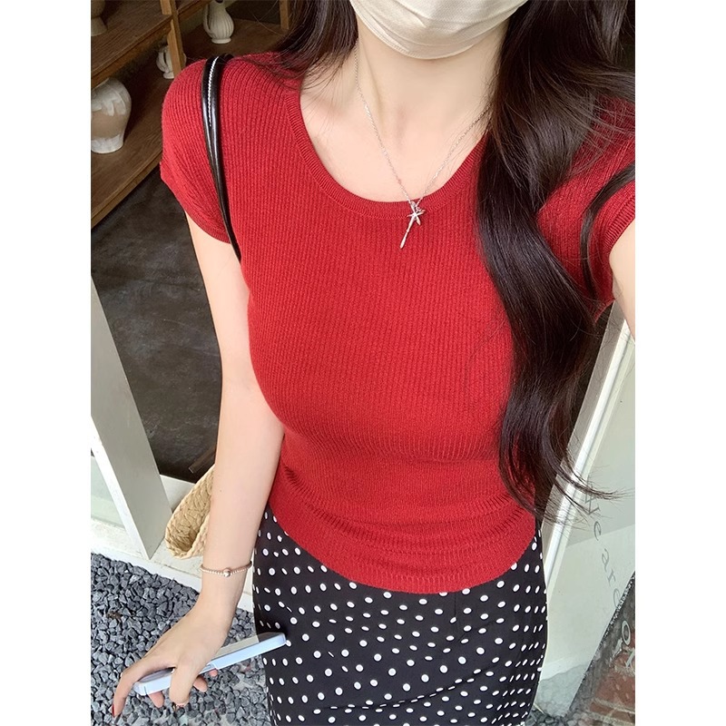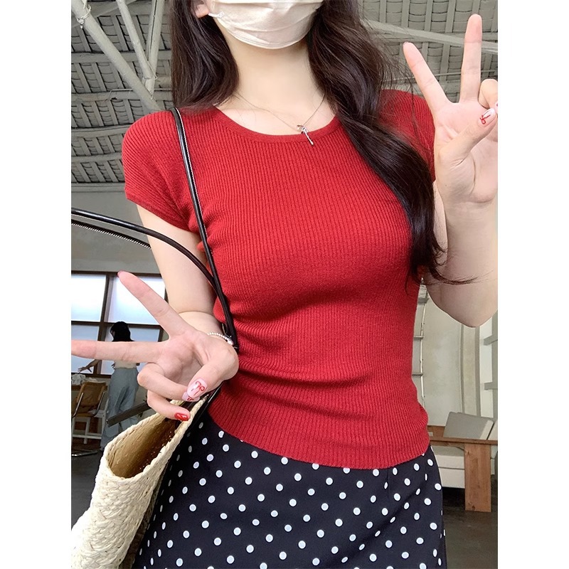 系带镂空露腰针织冰丝薄款微透短袖夏季修身短款T恤女小飞袖上衣