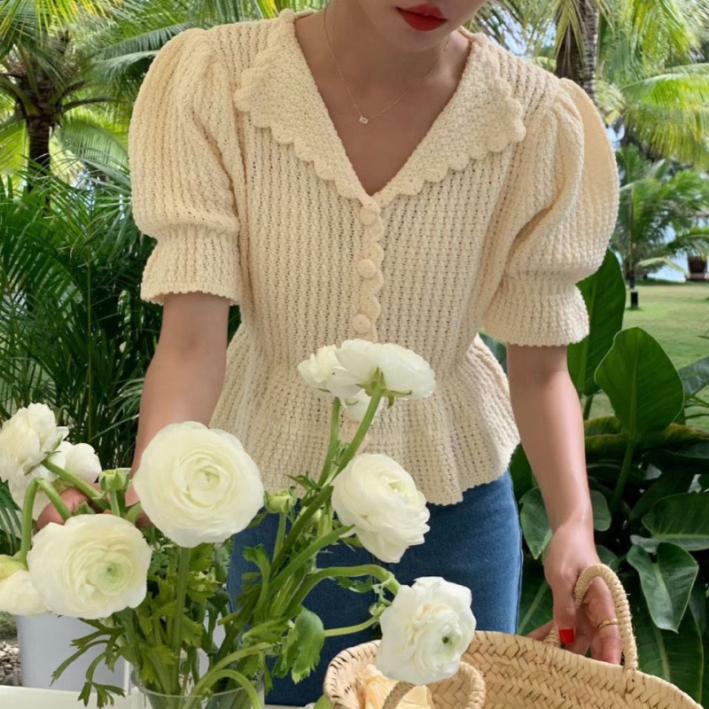 法式小香风针织短袖衬衫女夏装设计感小众短款v领泡泡收腰上衣