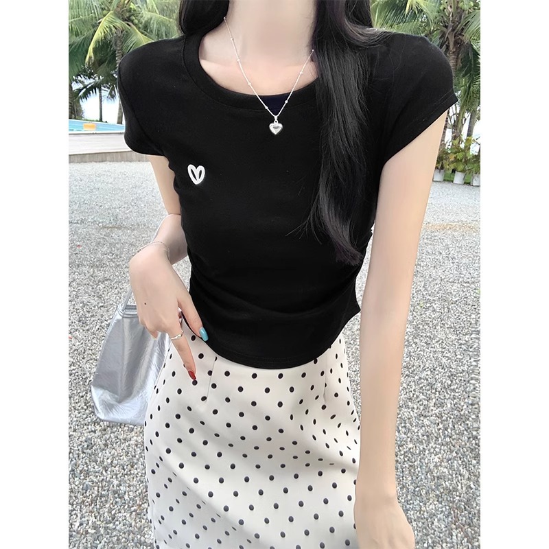夏季纯色正肩刺绣圆领减龄短袖T恤腰部褶皱收腰显瘦弹力短款上衣