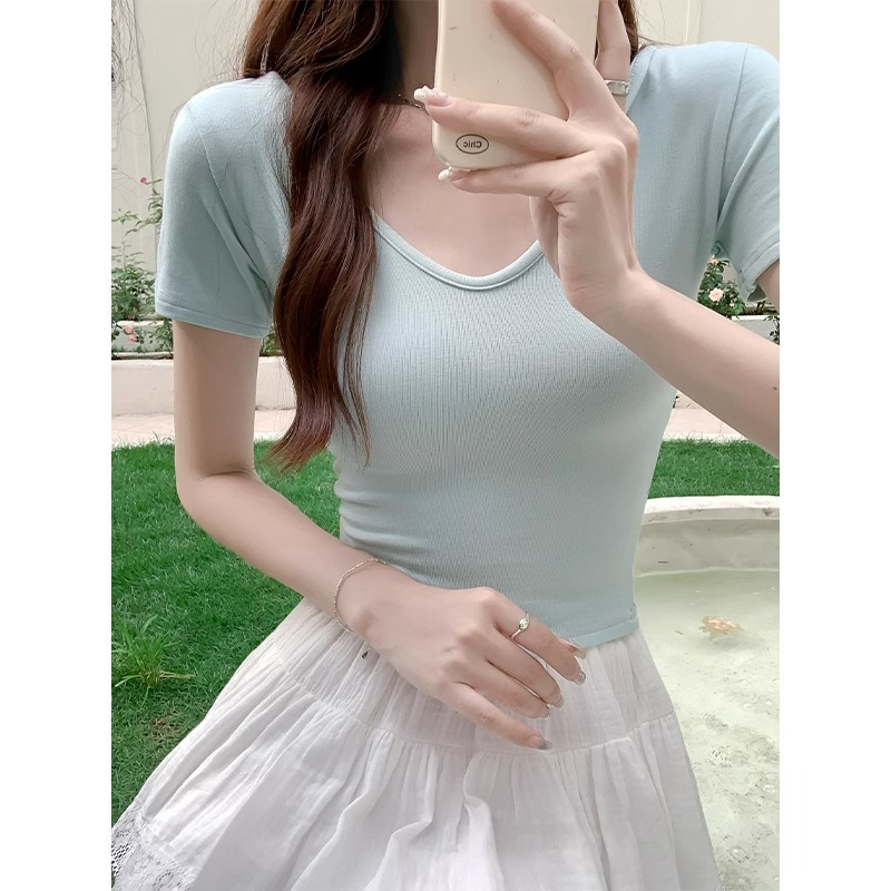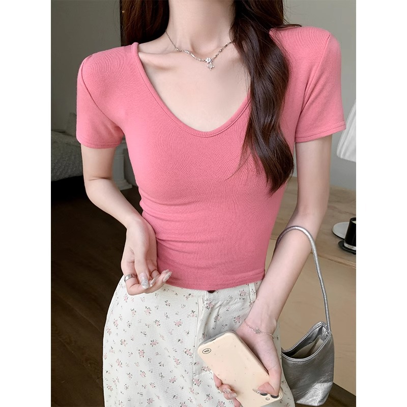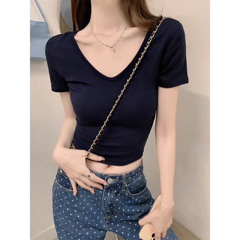 纯欲性感V领短袖t恤女夏季新款辣妹修身显瘦时尚百搭短款上衣