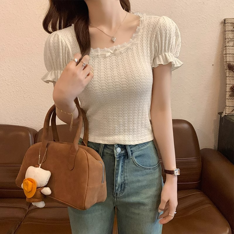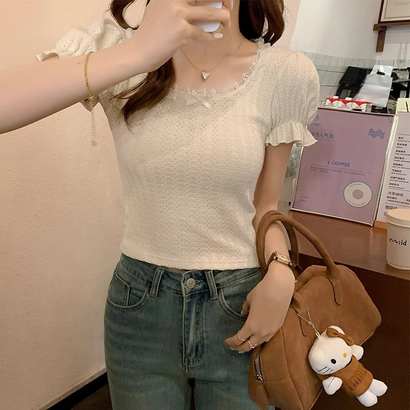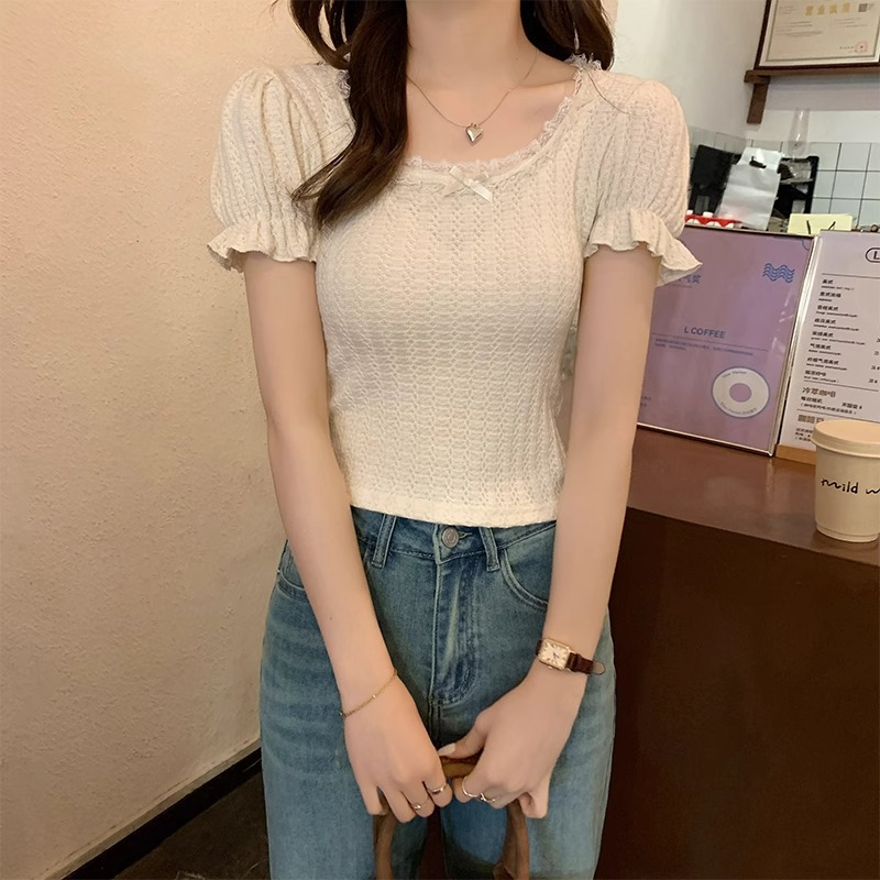 法式泡泡袖T恤女春夏新款复古气质高级感修身显瘦短款上衣ins