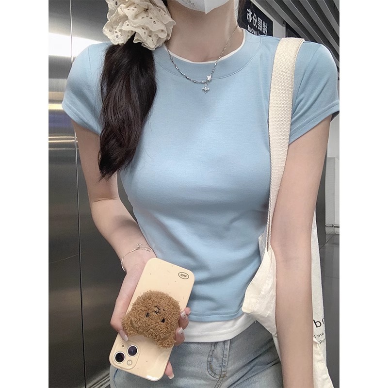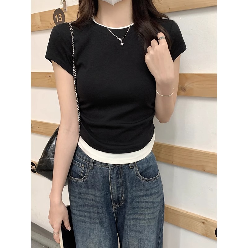 纯欲风圆领正肩短袖t恤女春夏设计感假两件褶皱收腰辣妹短款上衣