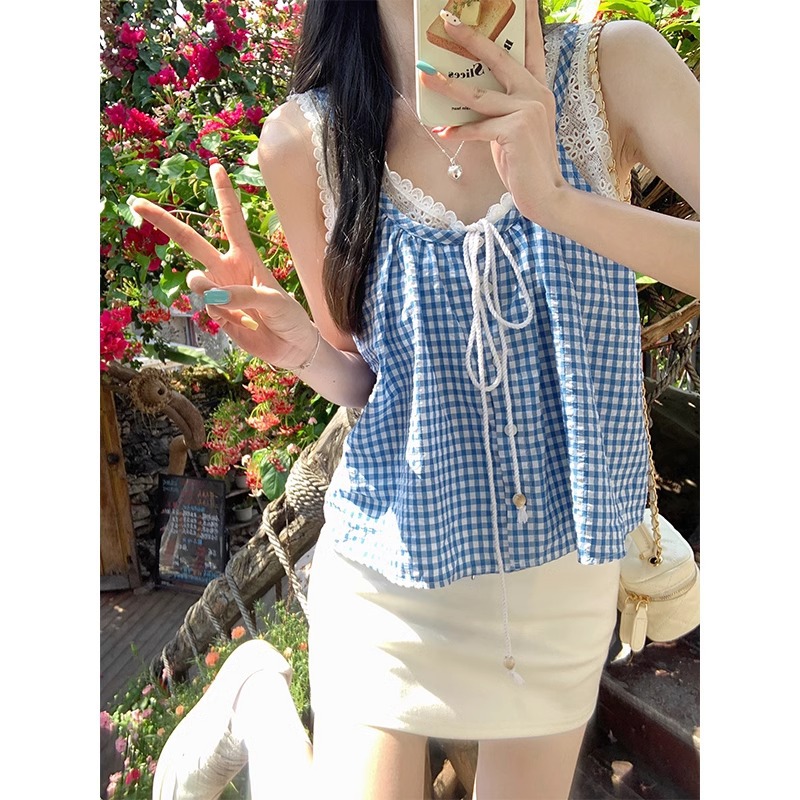 法式田园风假两件吊带背心女夏新款蓝格子宽松遮肉甜美小个子上衣