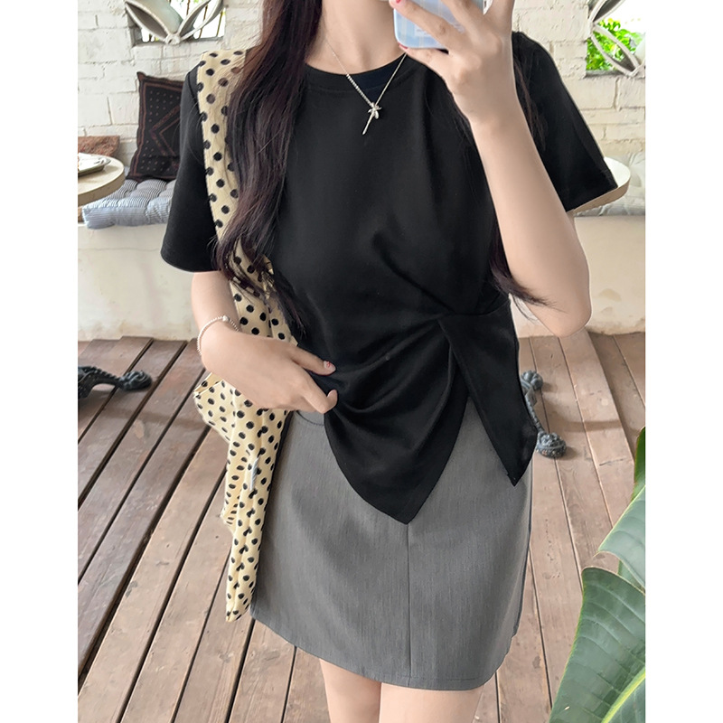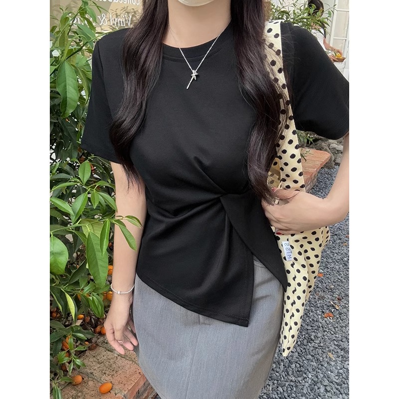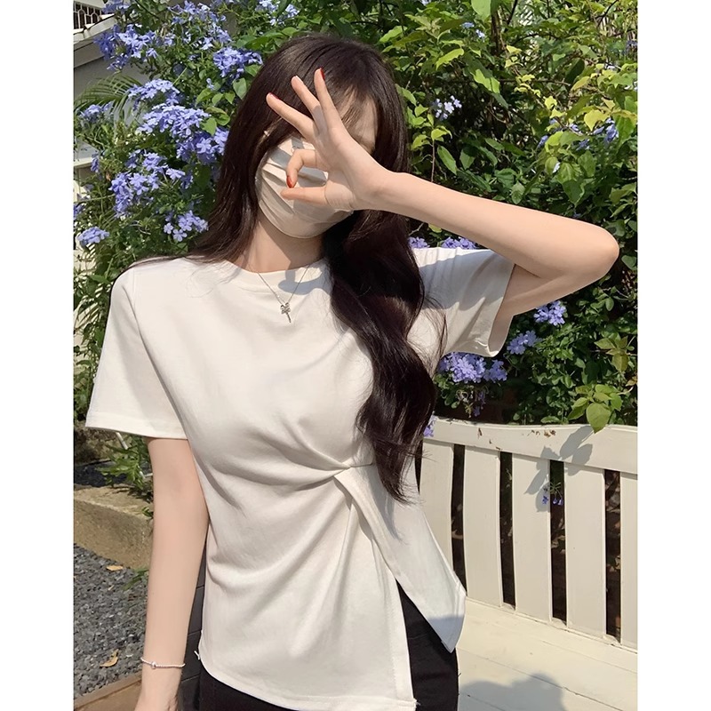 白色正肩圆领短袖T恤女夏季设计感不规则扭结开叉甜辣妹修身上衣