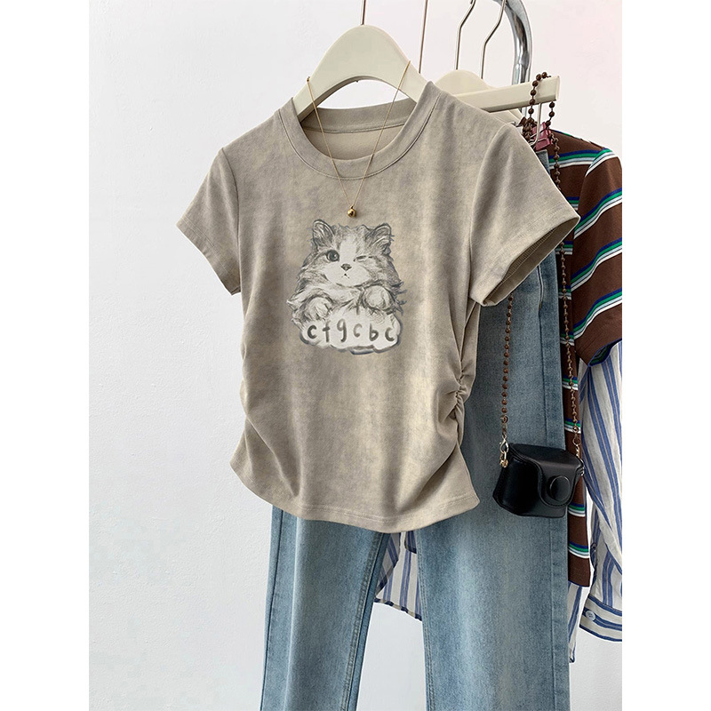 纯棉扎染猫咪正肩短袖t恤女夏季新款爆款设计感修身短款上衣