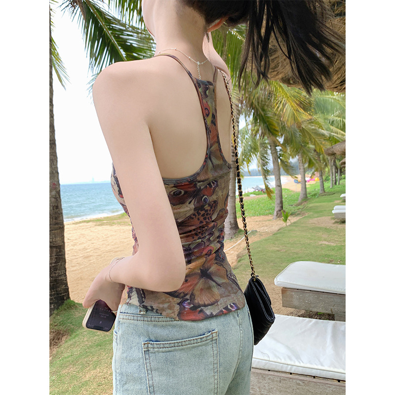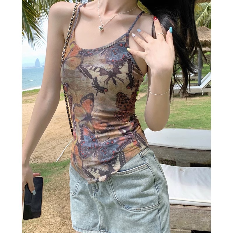 美式辣妹复古蝴蝶印花性感小吊带女夏季外穿bm修身不规则背心上衣
