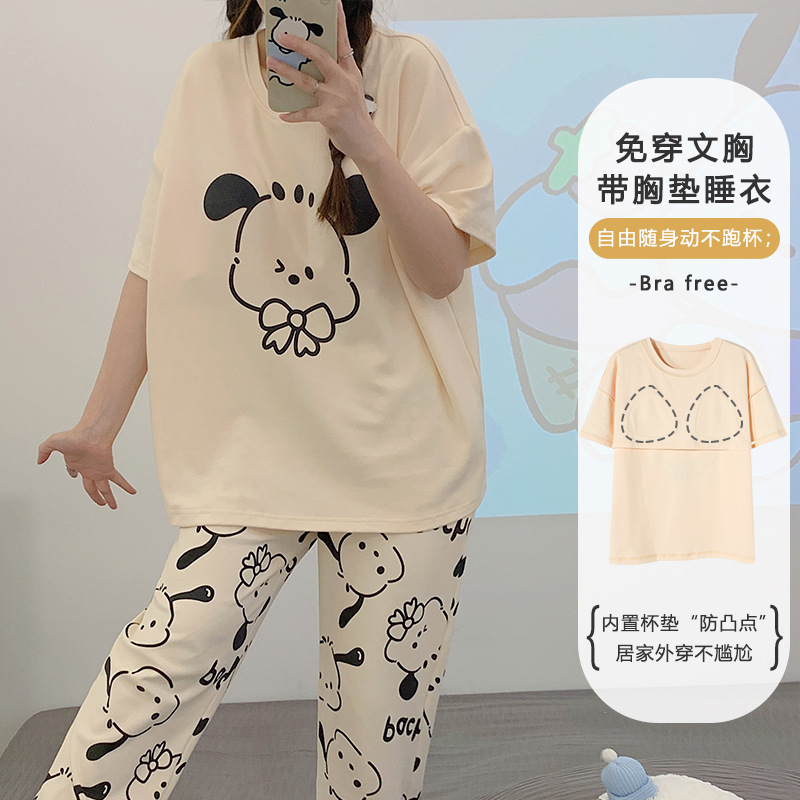 带胸垫睡衣女士夏季纯棉短袖长裤可外穿卡通套头家居服新款