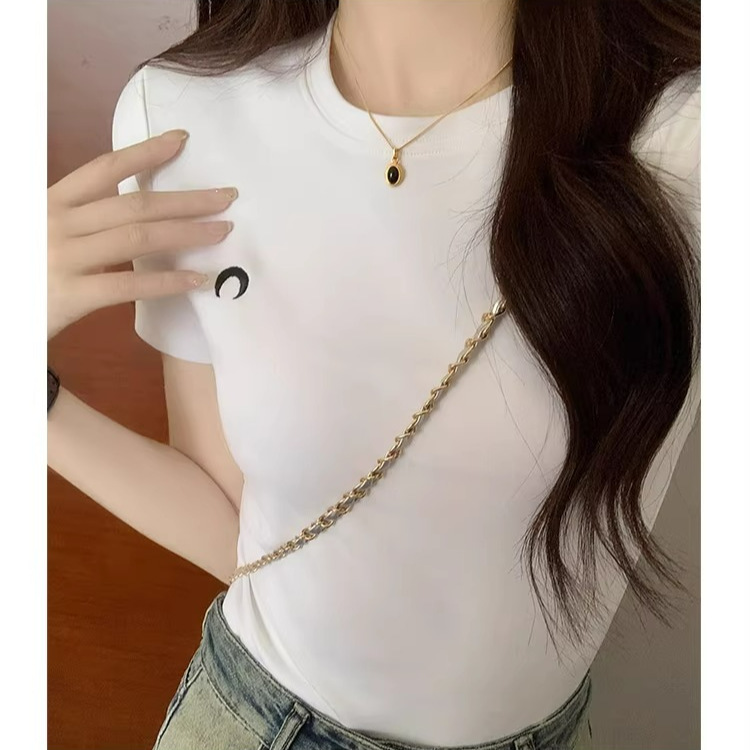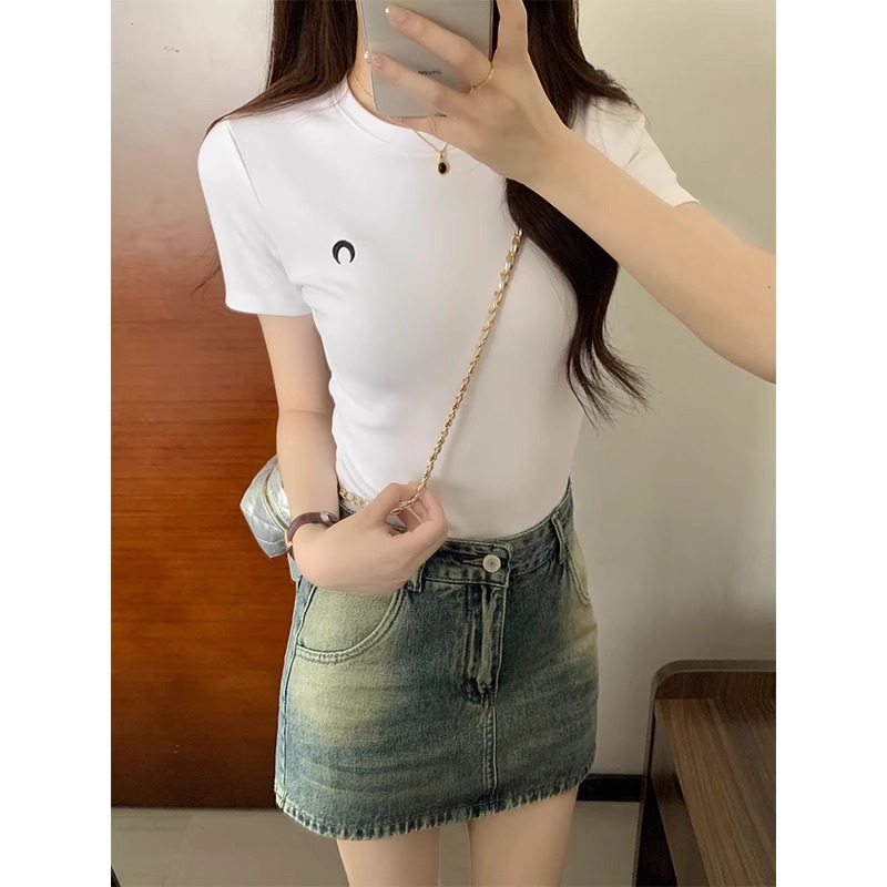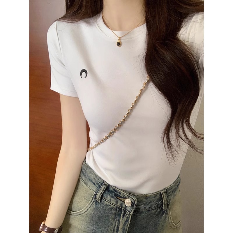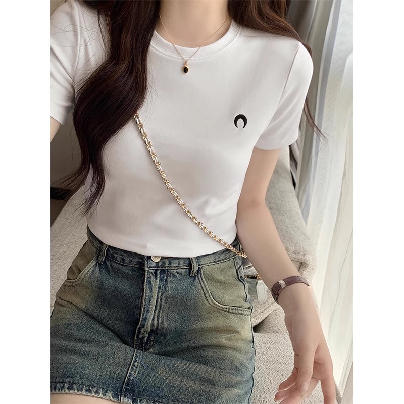 白色圆领正肩短袖t恤女春季新款纯欲风刺绣修身显瘦辣妹内搭上衣