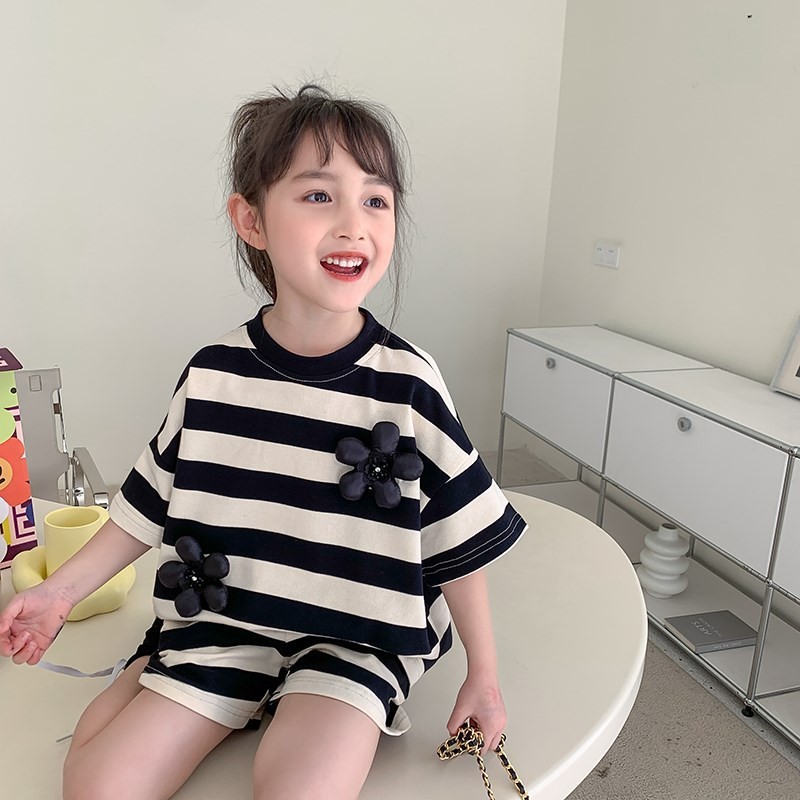 夏季新款女童套装夏款百搭黑白条纹两件套送小花花休闲款1132