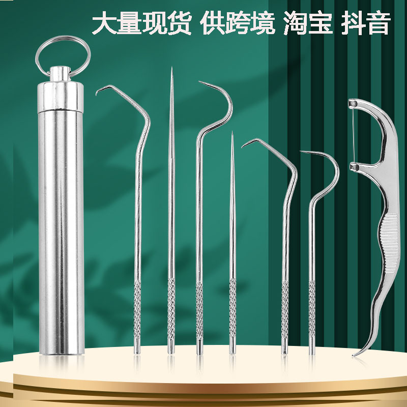 304不锈钢牙签随身便携金属弯针钩针牙签收纳桶套装牙齿剔牙工具