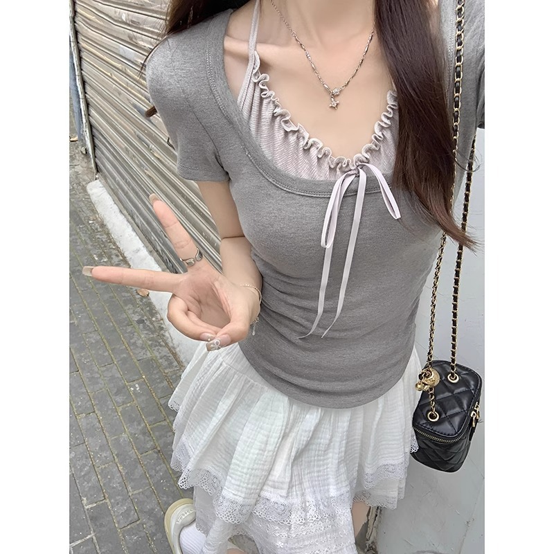木耳边假两件挂脖纯欲短袖女夏辣妹蝴蝶结褶皱收腰正肩T恤女上衣