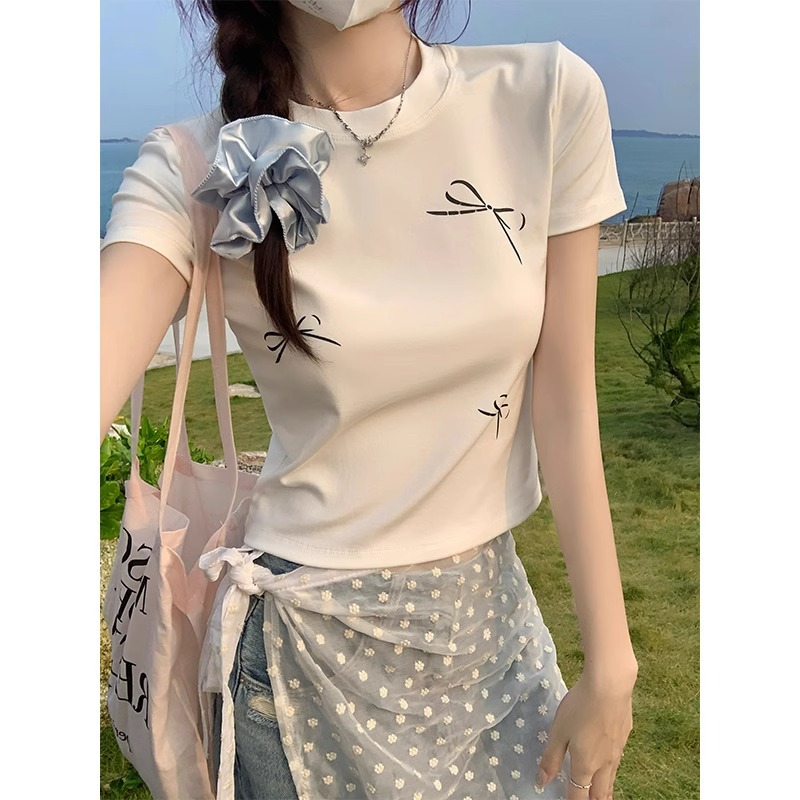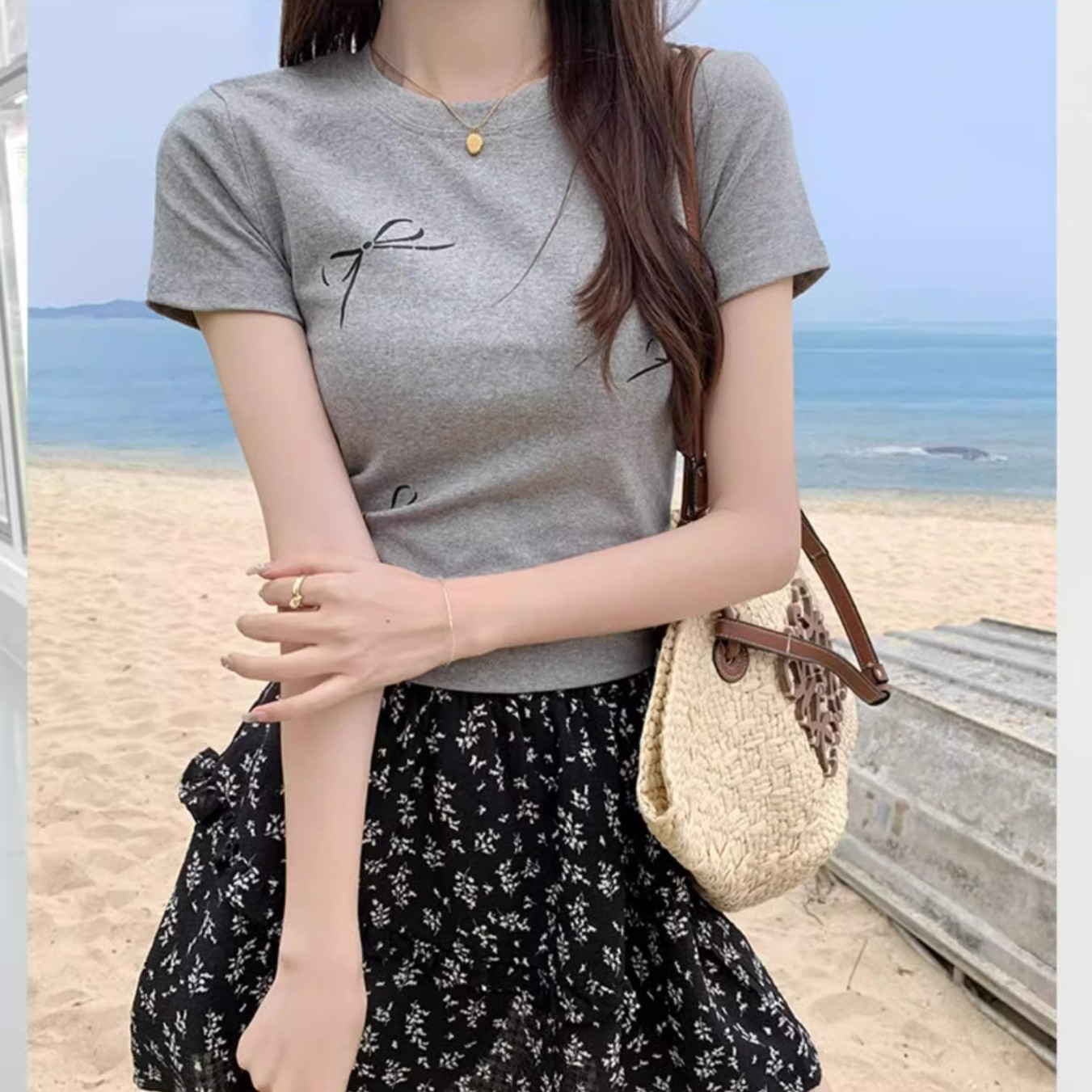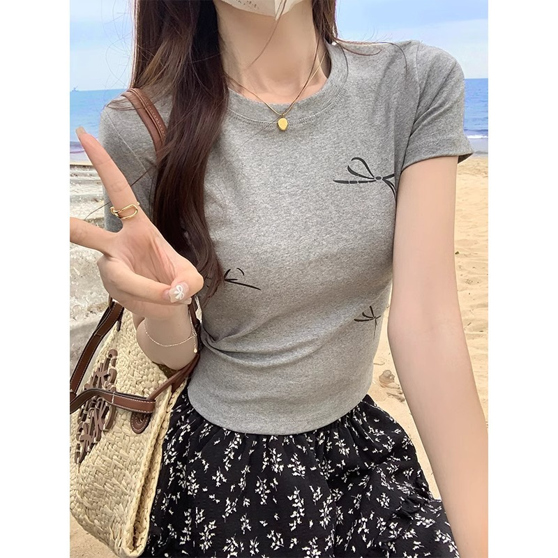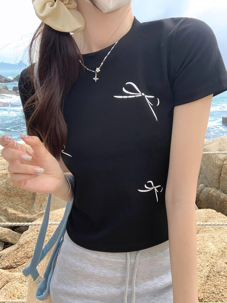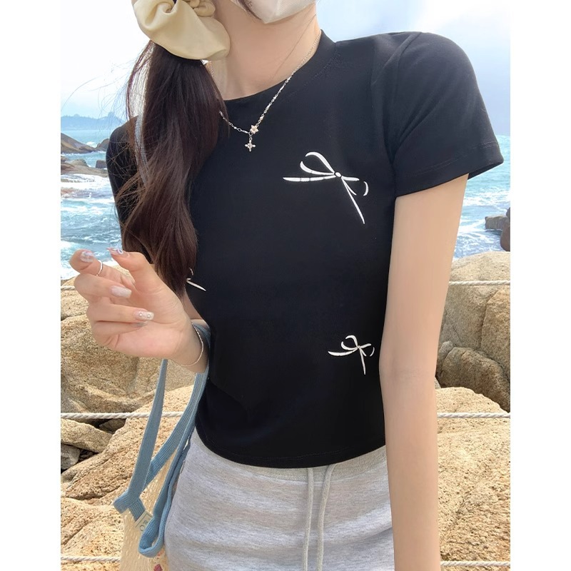 设计感小众蝴蝶结圆领T恤女小个子夏季新款甜美修身显瘦短袖上衣