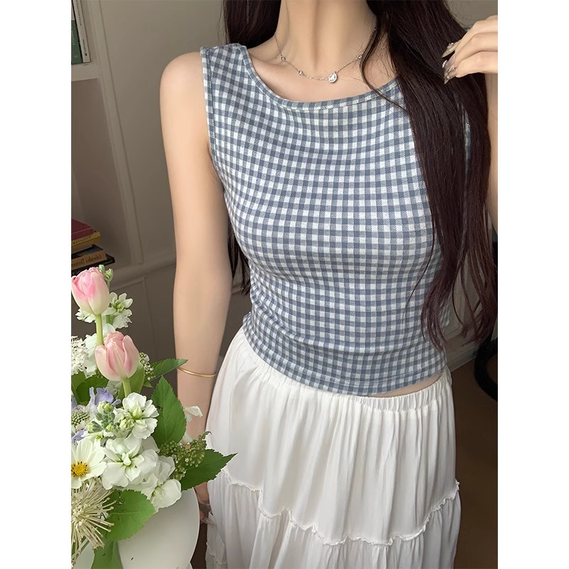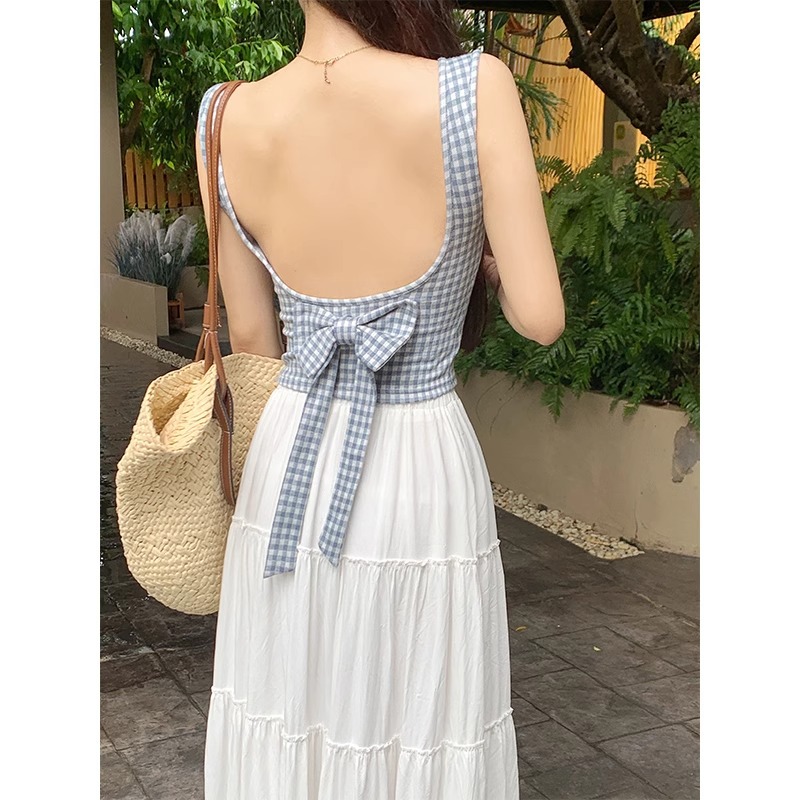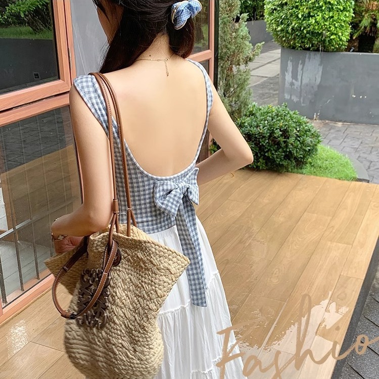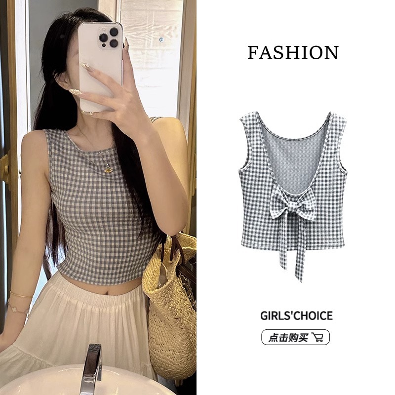 法式露背蝴蝶结格子吊带背心女夏外穿甜辣设计感修身短款无袖上衣