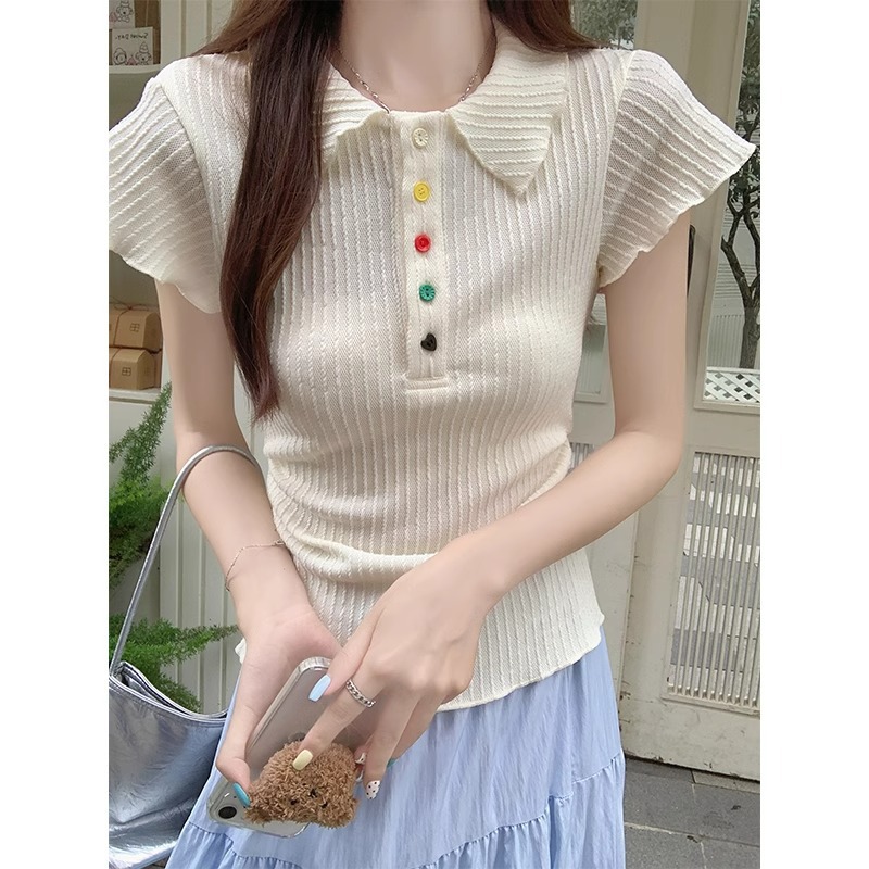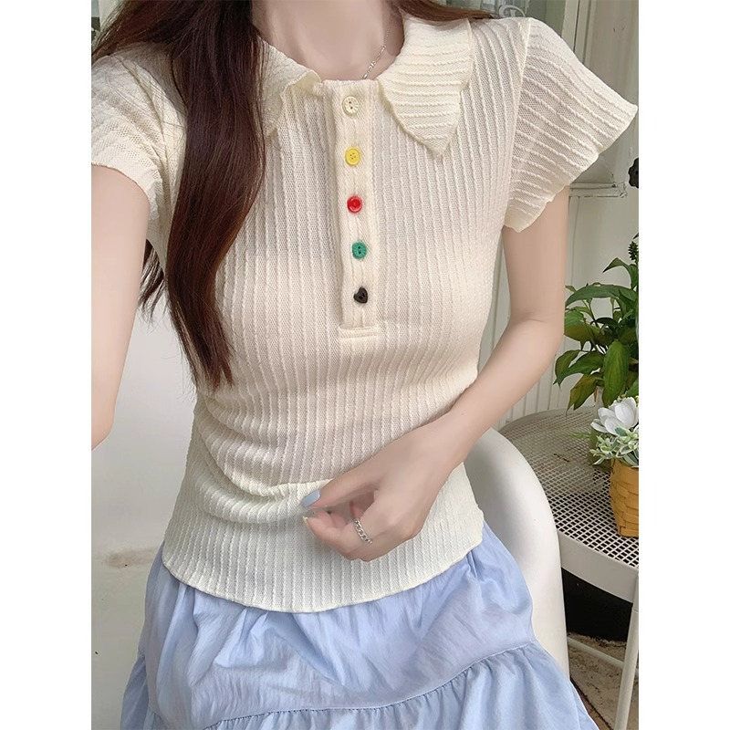 别致彩色纽扣POLO翻领短袖t恤女夏季修身显瘦褶皱收腰设计感上衣