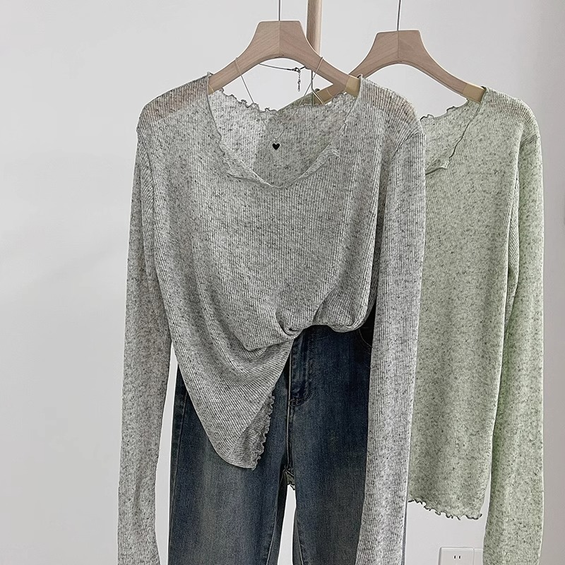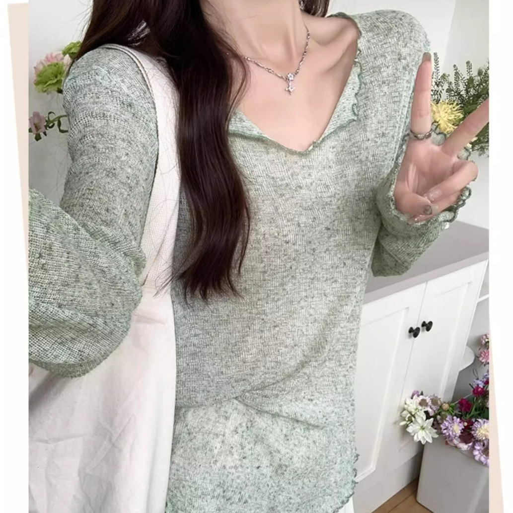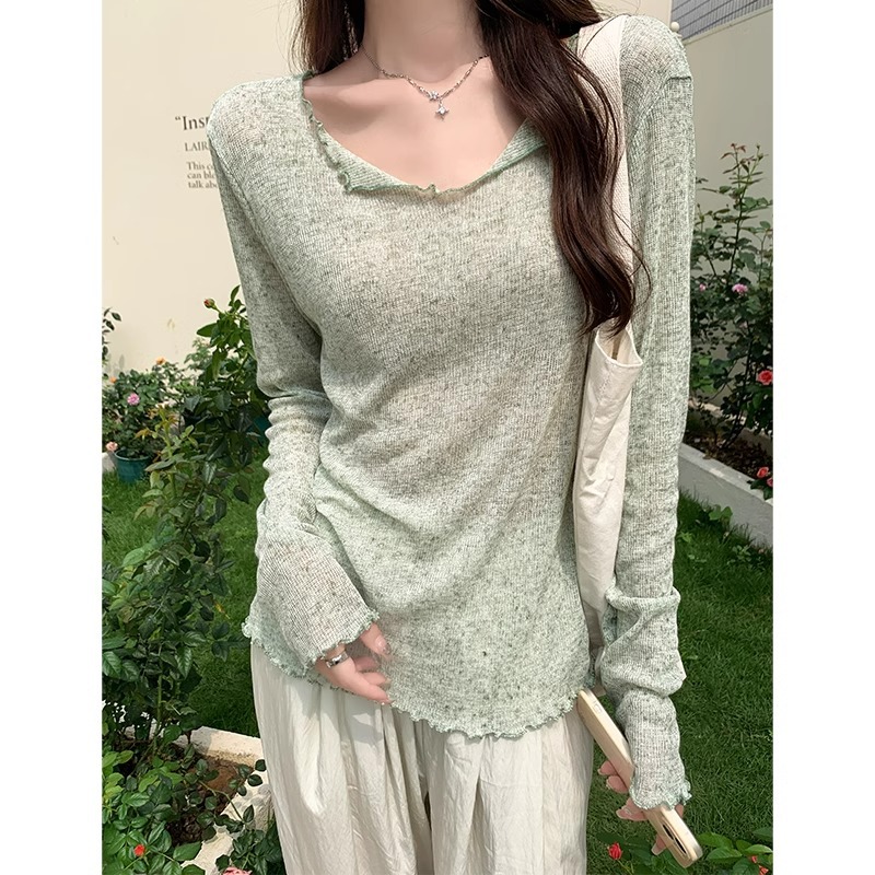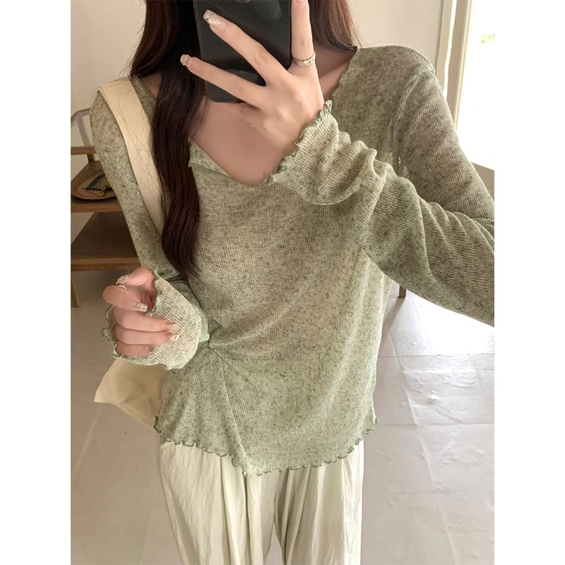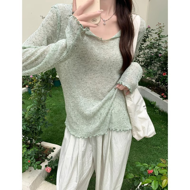 绿色v领露锁骨针织长袖T恤女夏冰丝薄款防晒罩衫设计感木耳边上衣