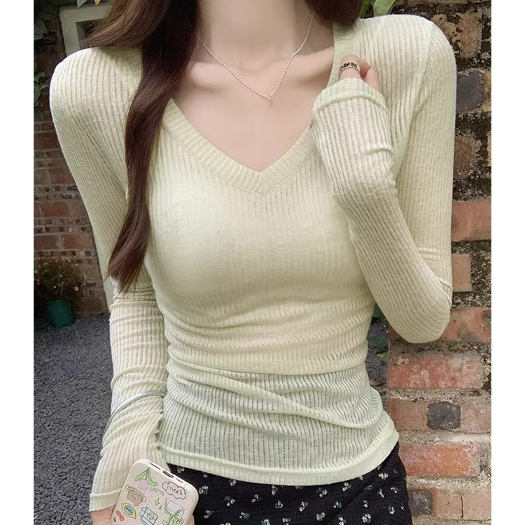 韩版夏季百搭纯色长袖v领辣妹甜妹上衣收腰修身性感短款正肩女T恤