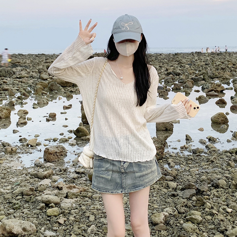 夏季微透V领木耳边宽松防晒罩衫冰丝薄款夏季长袖T恤女慵懒感上衣