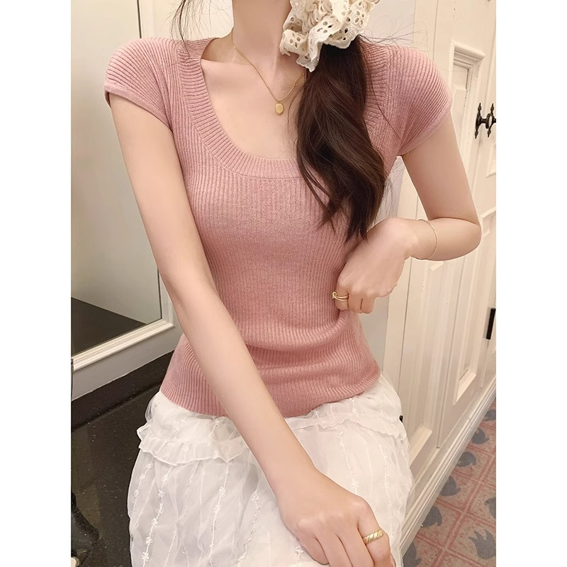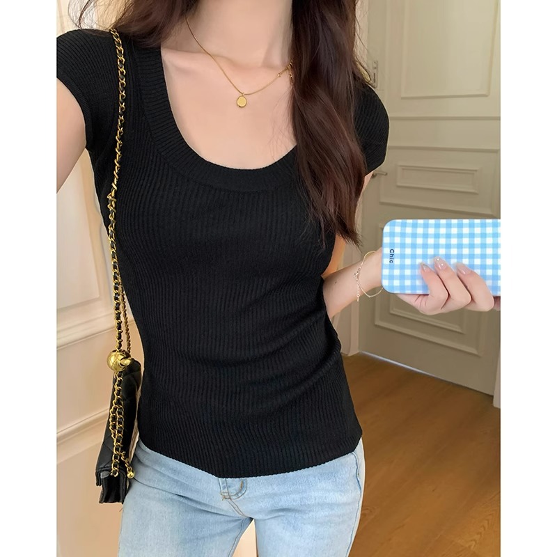 白色u领冰丝针织短袖t恤女夏季薄款大领口纯欲辣妹风修身短款上衣