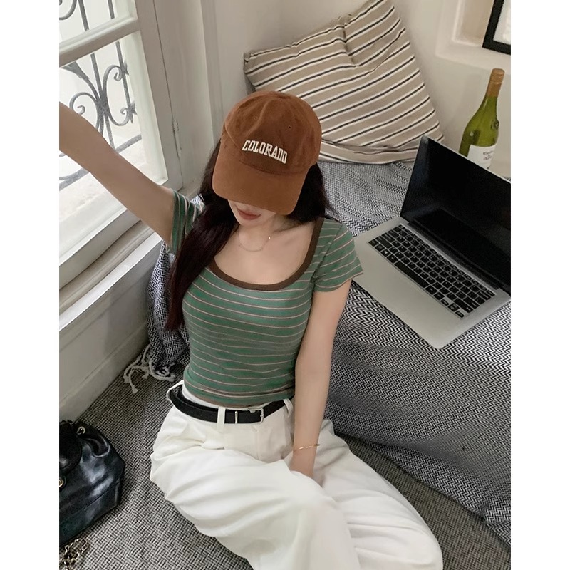 纯欲低领撞色设计感短袖T恤女夏季新款修身显瘦别致条纹上衣
