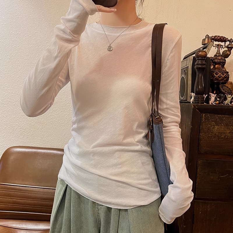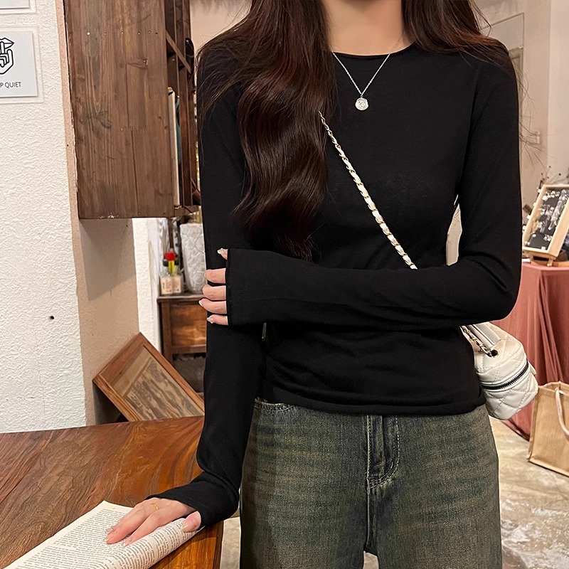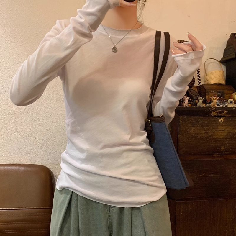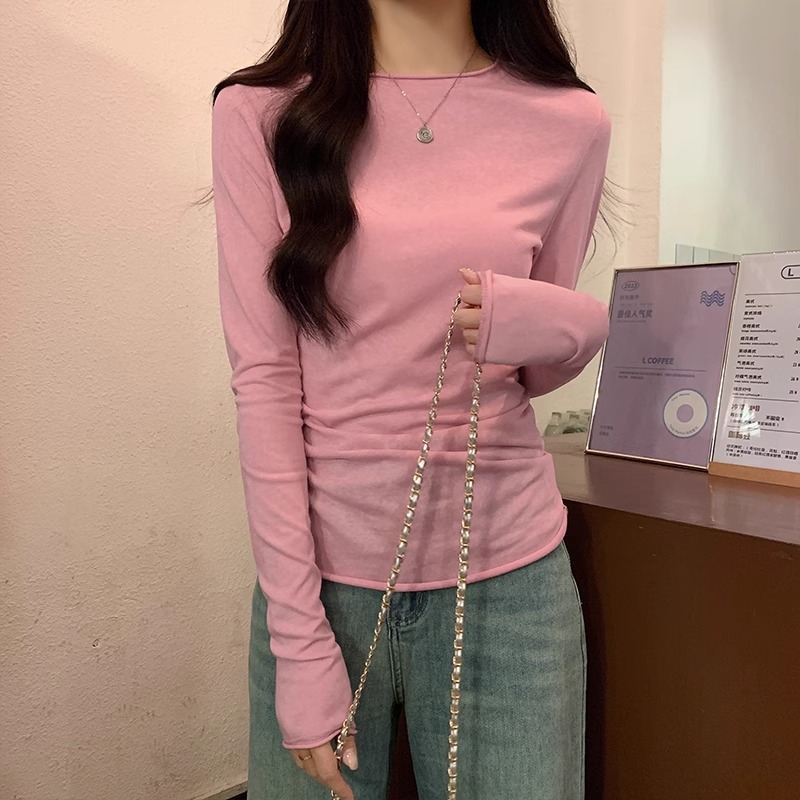 新款蓝色卷边圆领长袖t恤女春秋收腰显瘦修身内搭打底衫上衣