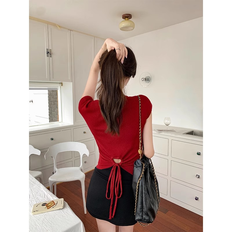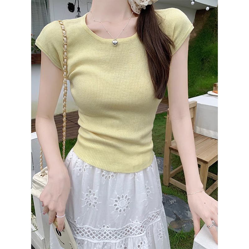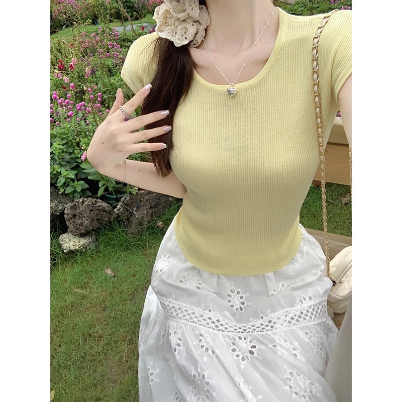 法式黄色圆领针织修身上衣弹力收腰后背系带短袖夏季甜辣妹T恤女