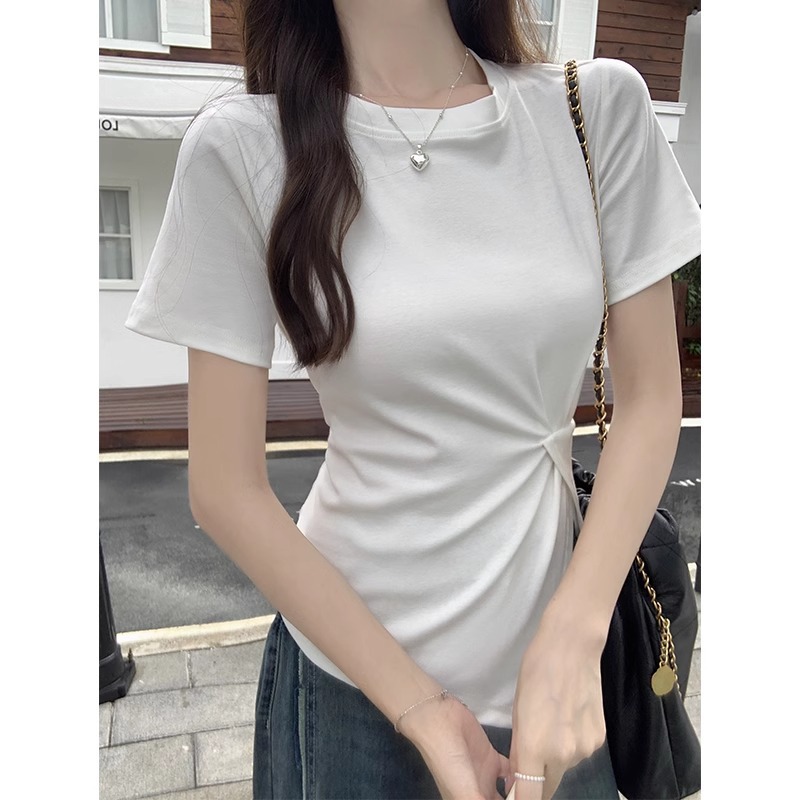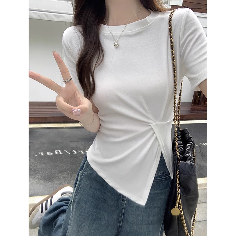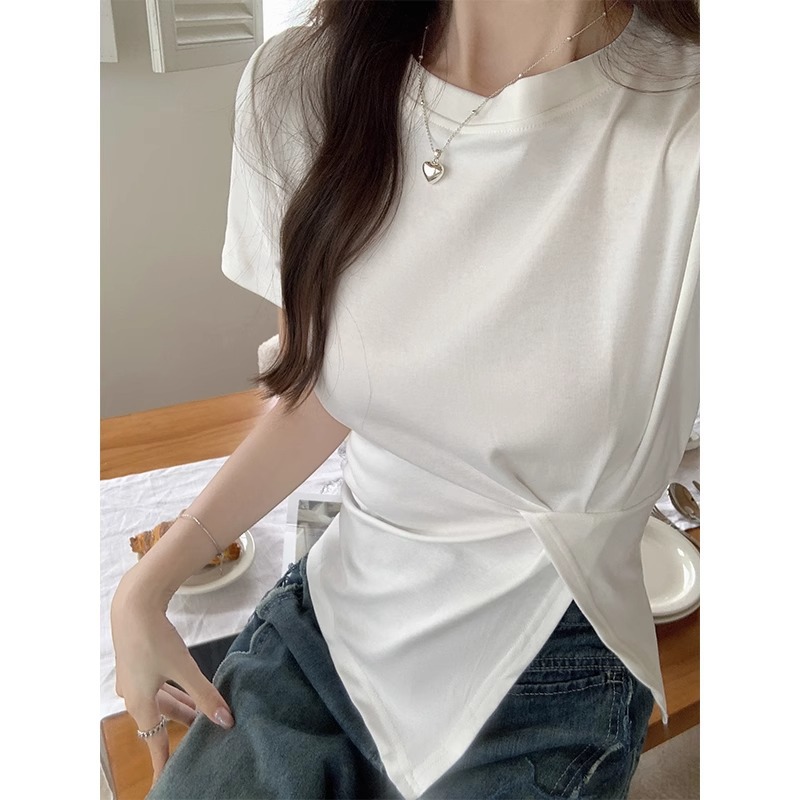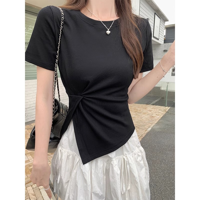 夏新款圆领正肩短袖T恤女设计感不规则扭结下摆修身显瘦上衣